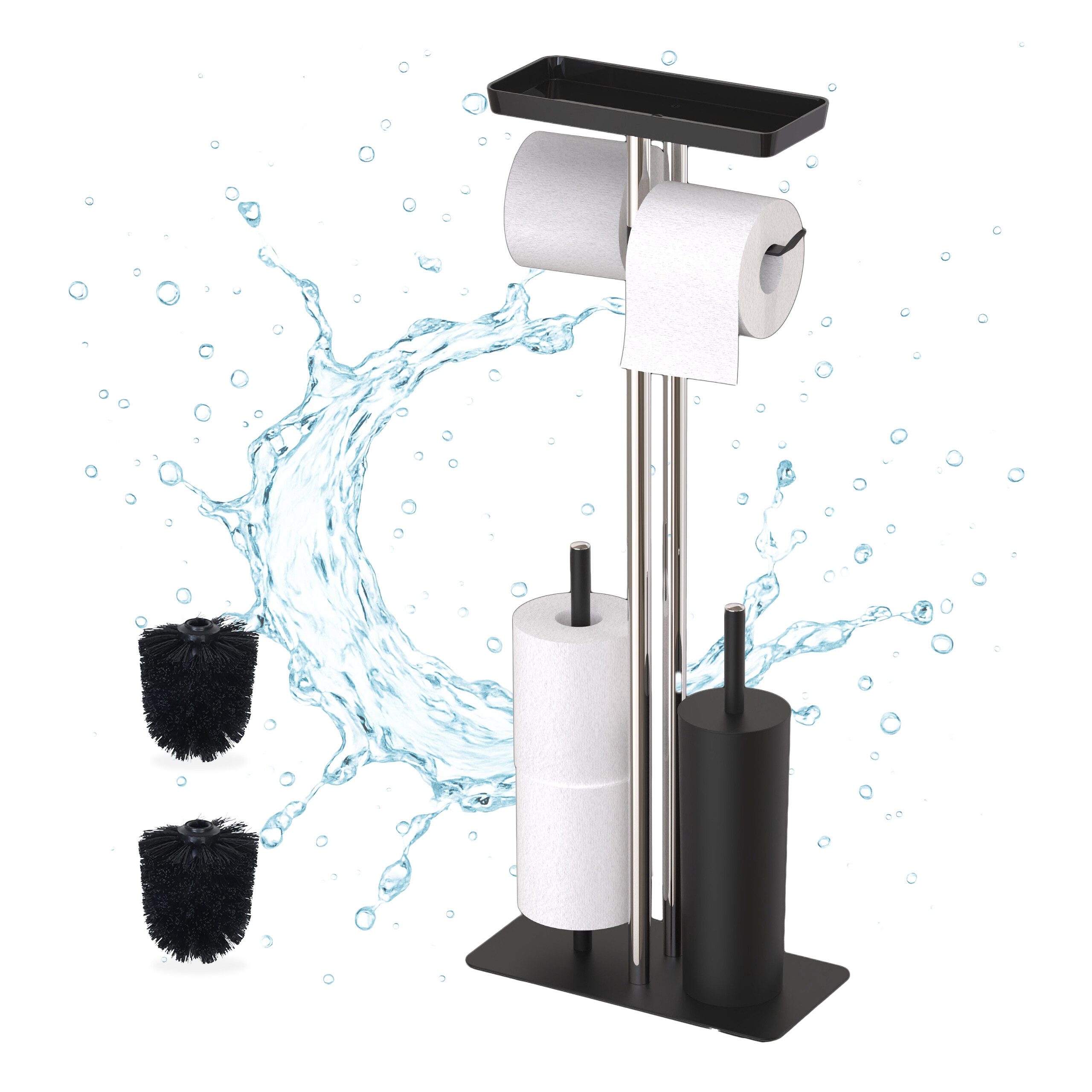 Stehender Klopapierhalter mit WC-Bürste - Praktische Kombination aus 2 Klopapierhalten und Bürstenhalter - Hygienisch wechselbarer Bürstenkopf - Inkl. 2 Ersatzköpfen - Dank Reserverollenhalter ist die nächste Rolle stets griffbereit - Mit Ablage für Smartphone, feuchtes Toilettenpapier uvm. - Klobürstenhalter mit schwerer Bodenplatte für sicheren Stand - Stilvolles Design aus Metall fügt sich in viele Badeinrichtungen ein - Freistehende Toilettenbürstengarnitur für Bad oder Gäste-WC