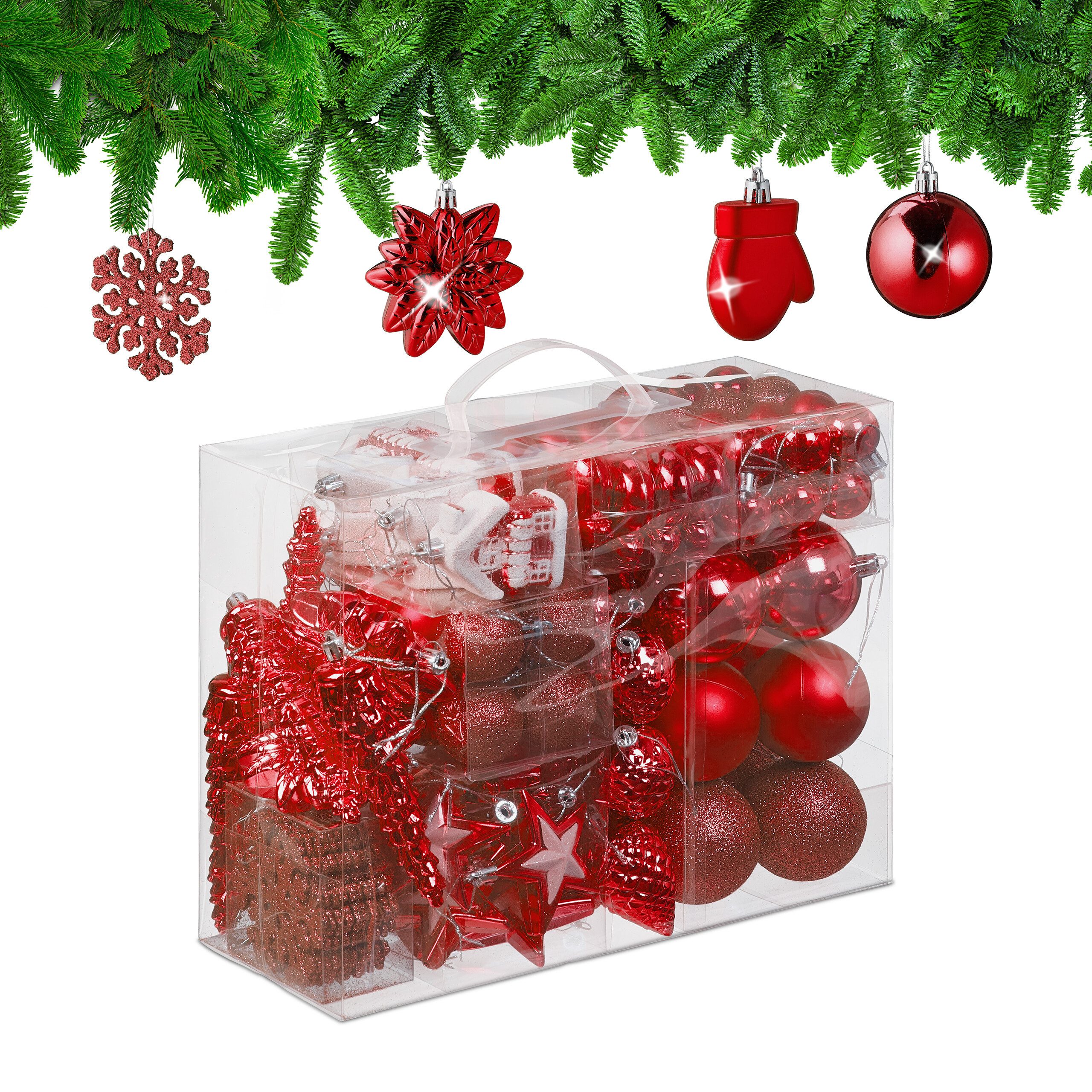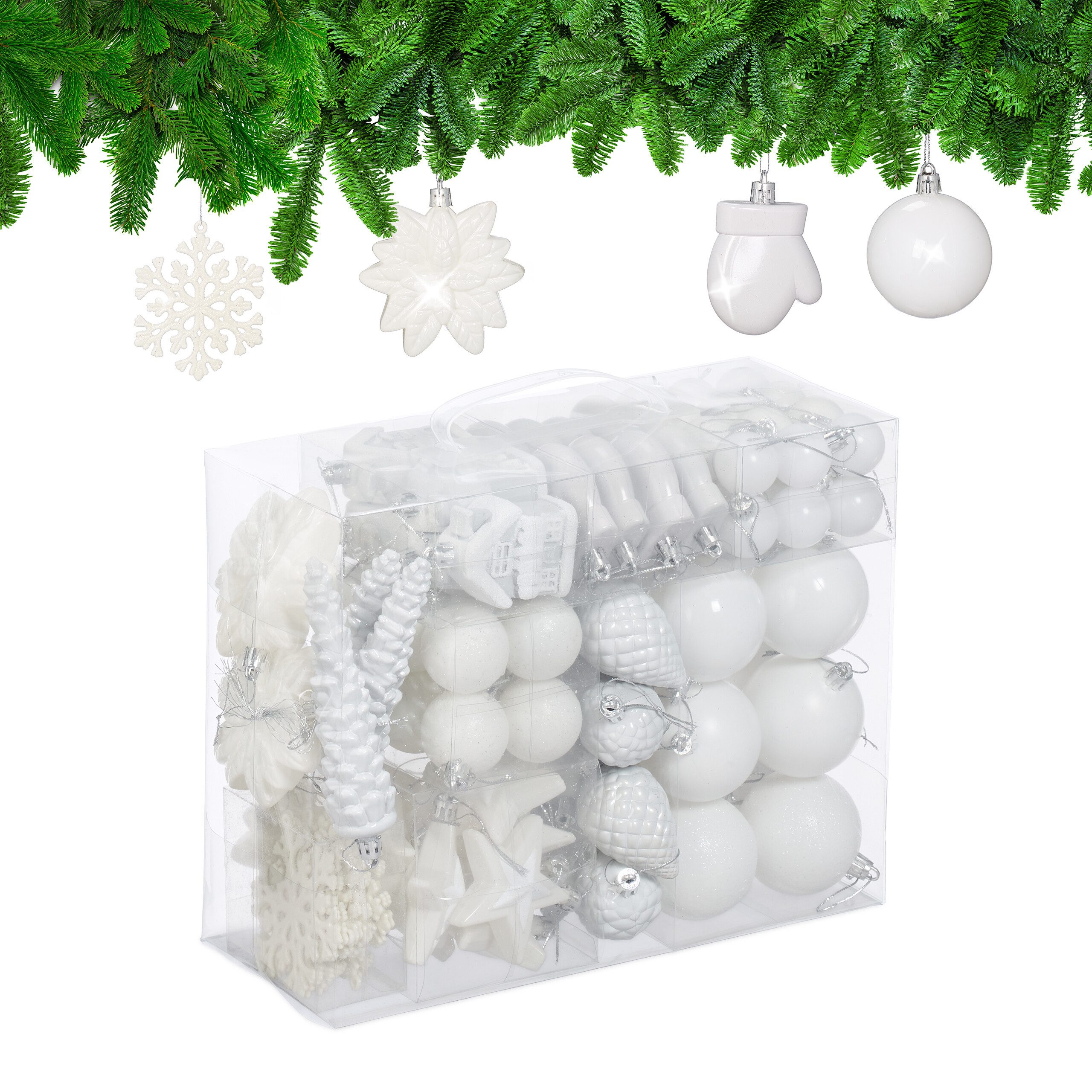 Mit dem großen Christbaumkugelset kannst Du den Tannenbaum prachtvoll schmücken. Die Ornamente in unterschiedlichen Größen und Designs mit matter, glänzender oder glitzernder Oberfläche lassen sich dabei ganz individuell geschmackvoll arrangieren. Der festlich dekorierte Weihnachtsbaum bringt nicht nur Kinderaugen zum Strahlen, sondern sorgt auch bei Erwachsenen für eine besinnliche Atmosphäre zur schönsten Zeit des Jahres. An den silbernen Bändchen lassen sich die Baumkugeln leicht aufhängen.