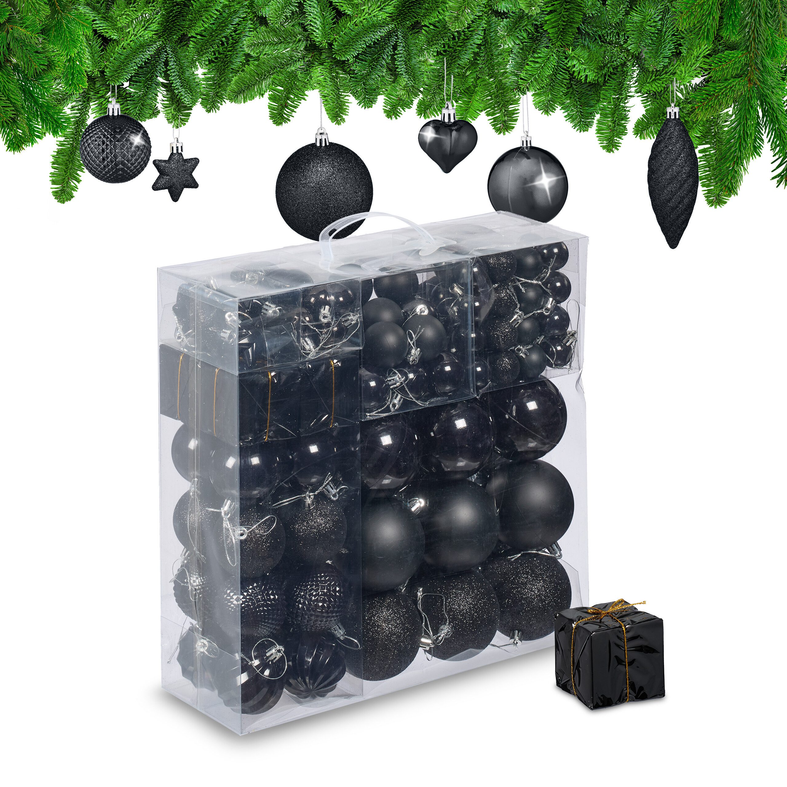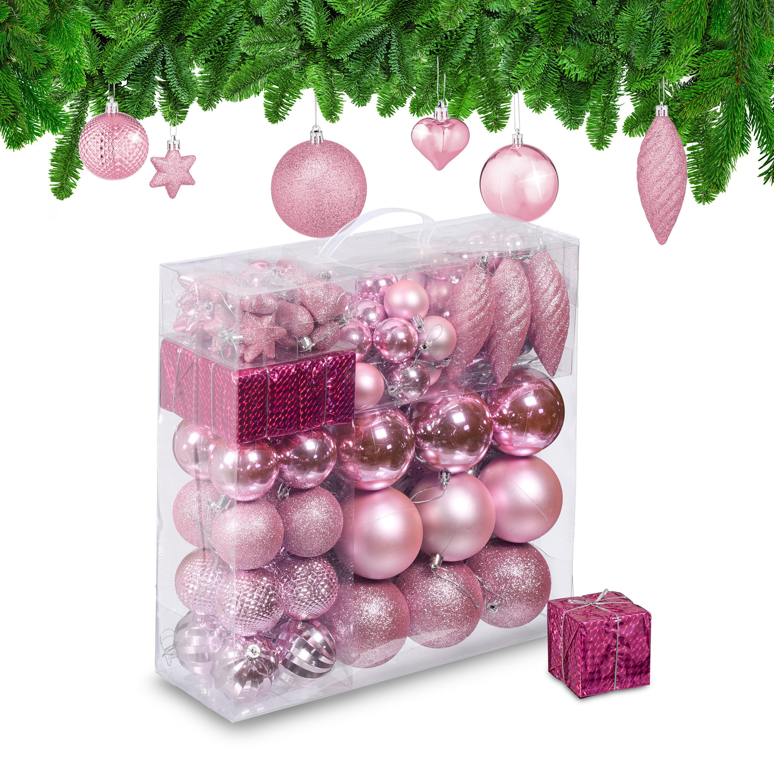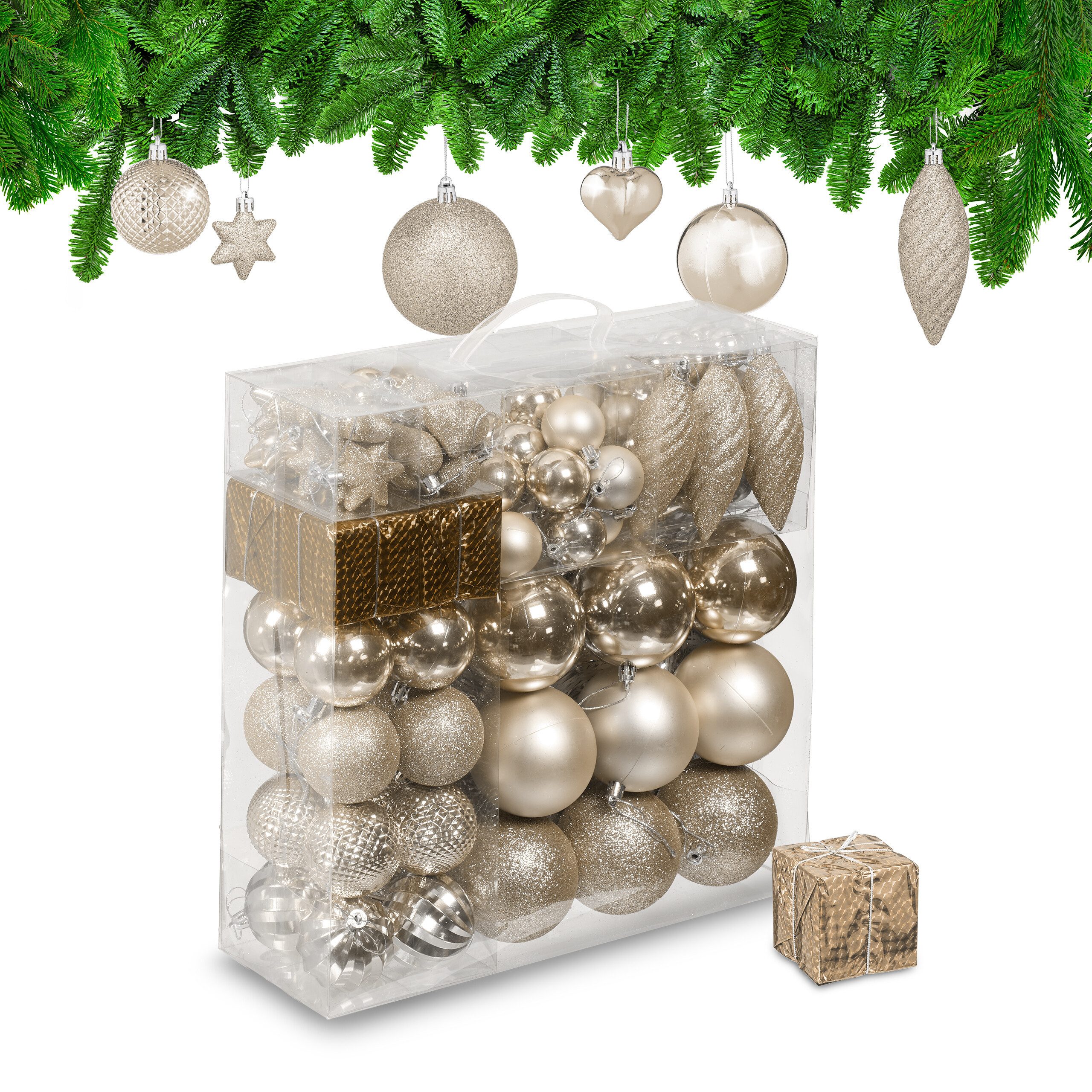Lieferumfang - 9x große Weihnachtsbaumkugel - 16x mittlere Weihnachtsbaumkugel - 18x kleine Weihnachtsbaumkugel - 32x Mini-Weihnachtsbaumkugel - 10x Herzen - 10x Sterne - 8x Lametta - 4x Geschenk - 3x Zapfen - 1x Aufbewahrungsbox - Dekoartikel sind nicht im Lieferumfang enthalten