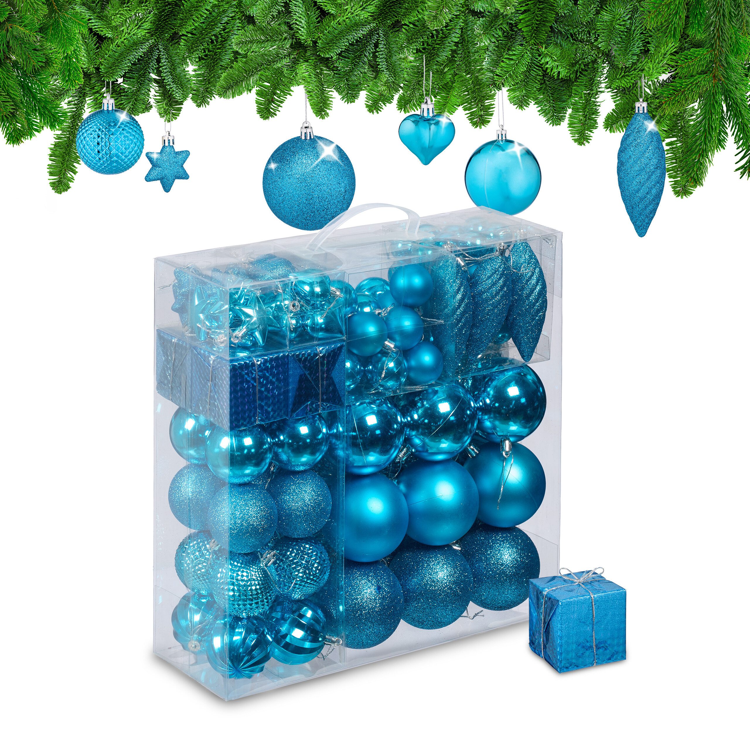 Christbaumkugeln im 110er Set - Weihnachtsbaum mit den Tannenkugeln festlich schmücken - Christbaumdeko mit Bändchen zum einfachen Aufhängen - Baumkugeln in glitzerndem, mattem und glänzendem Design - Glänzende Kugeln reflektieren das Licht für behaglichen Glanz - Langlebiger Baumschmuck aus bruchsicherem Kunststoff - Dekorative Weihnachtsbaumdeko für ein besinnliches Fest - Inklusive praktischer Aufbewahrungsbox mit Henkel