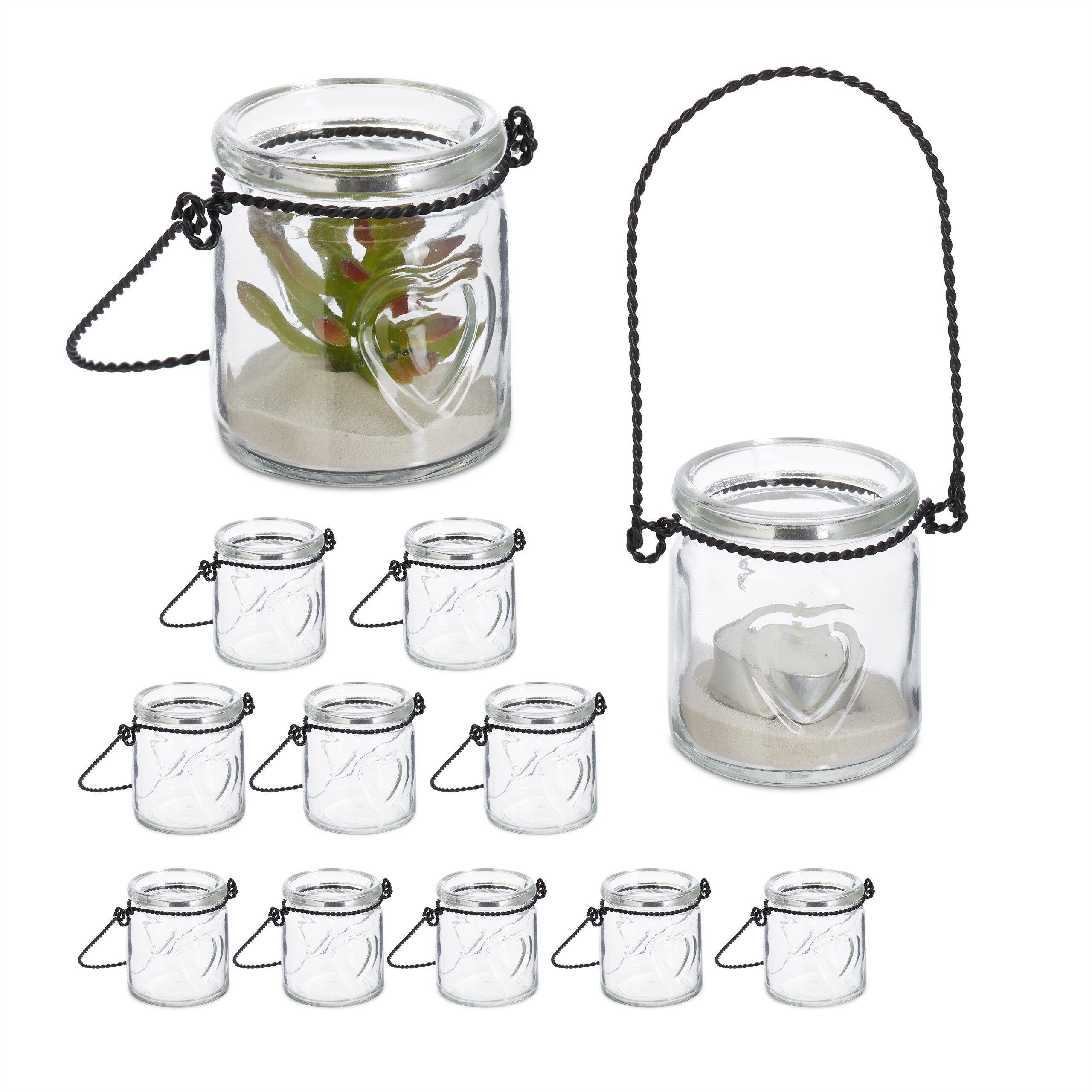 Mit diesen dekorativen Windlichtern zauberst Du im Handumdrehen eine gemütliche Atmosphäre bei Deiner Gartenparty oder einem relaxten Sommerabend auf dem Balkon. Platziere die Teelichtgläser im praktischen 12er Set einfach auf dem Tisch oder hänge sie dekorativ an den Henkeln auf. Auch als Tischdekoration bei Geburtstagen oder Hochzeiten machen die Teelichthalter eine gute Figur. Durch das Herz-Design und den Materialmix aus Glas und Metall sind die Kerzengläser außen und innen ein Blickfang.