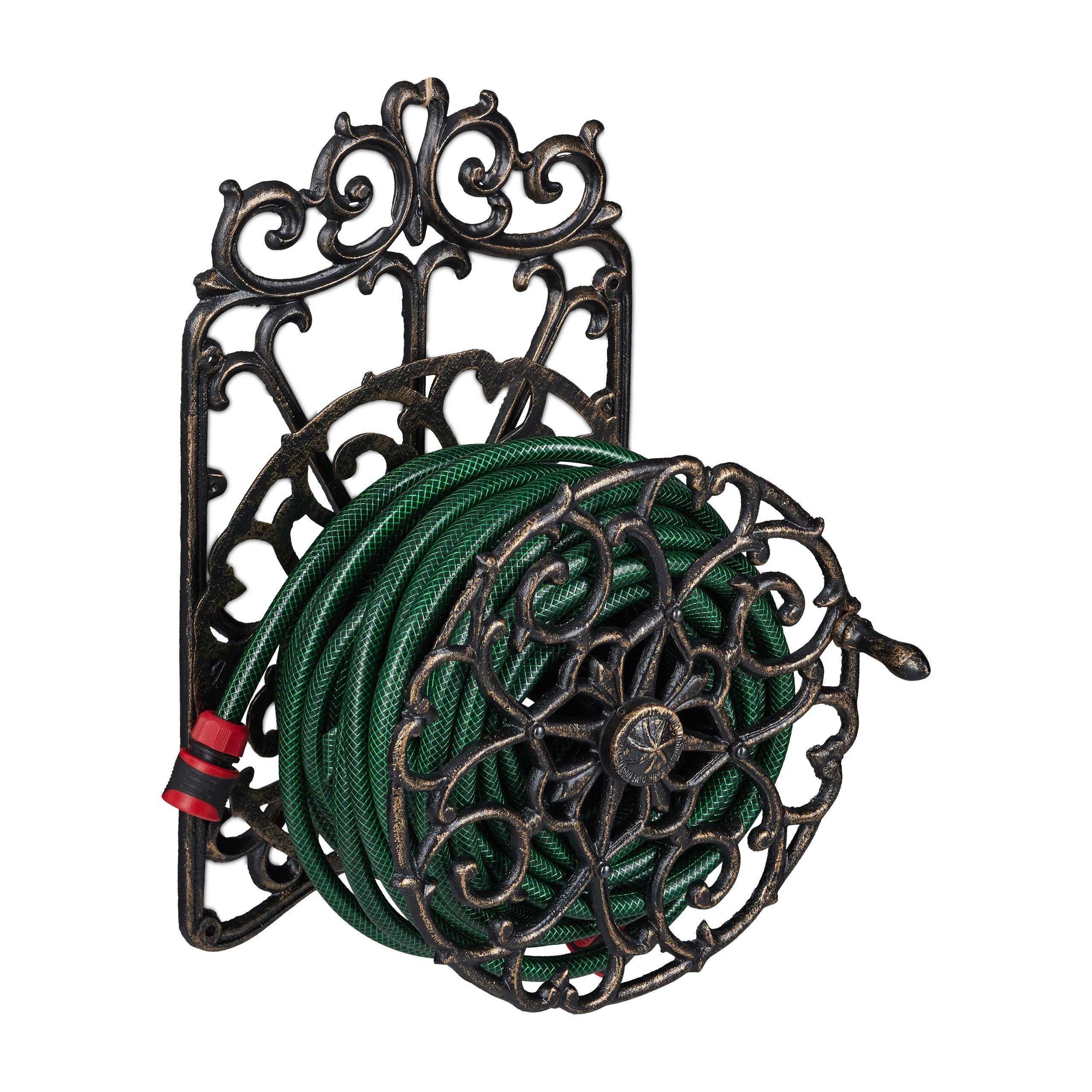 Der Schlauchhalter ist der praktische Helfer in jedem Garten. Rollen Sie Ihren Gartenschlauch platzsparend in der Halterung auf und bequem wieder ab. Dadurch knickt er nicht und ist immer einsatzbereit. Das imposante Rad an der Vorderseite fällt sofort ins Auge und ist mit einem Knauf in beide Richtungen drehbar. Gefertigt aus massivem Gusseisen und mit floralen Verzierungen versehen, ist der Wandschlauchhalter im nostalgischen Design ein absoluter Hingucker.
