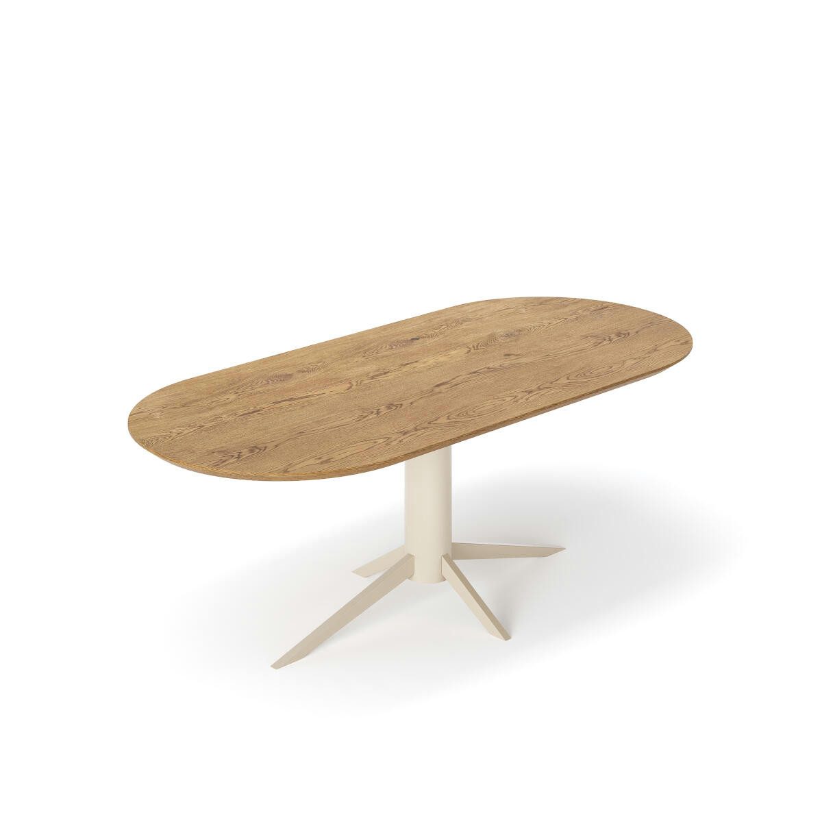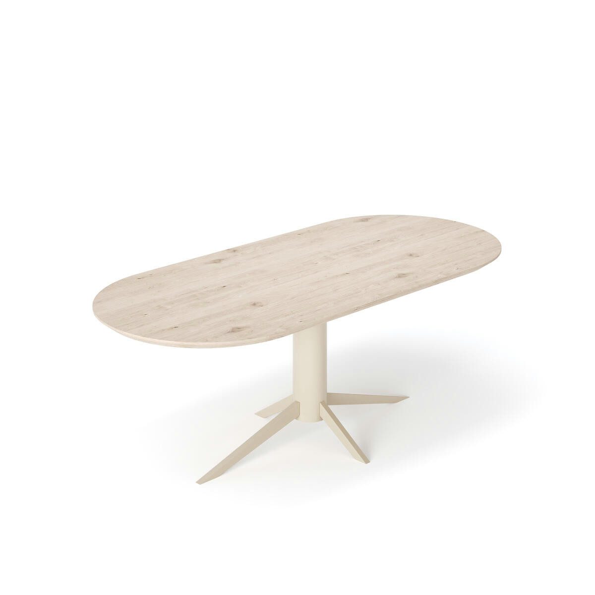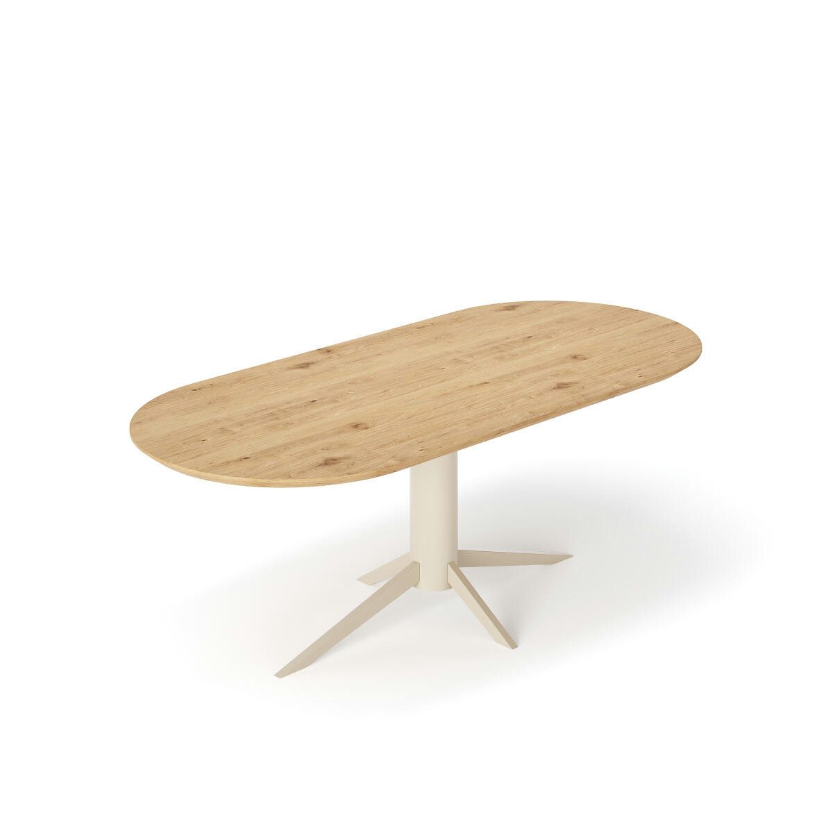 Der Tisch Lykke verbindet modernes skandinavisches Design mit der zeitlosen Schönheit von massiver Wildeiche. Die sanfte Pilleform verleiht dem Tisch eine harmonische Eleganz, während das beige 4-Bein-Gestell aus pulverbeschichtetem Stahl für einen stabilen Stand sorgt.