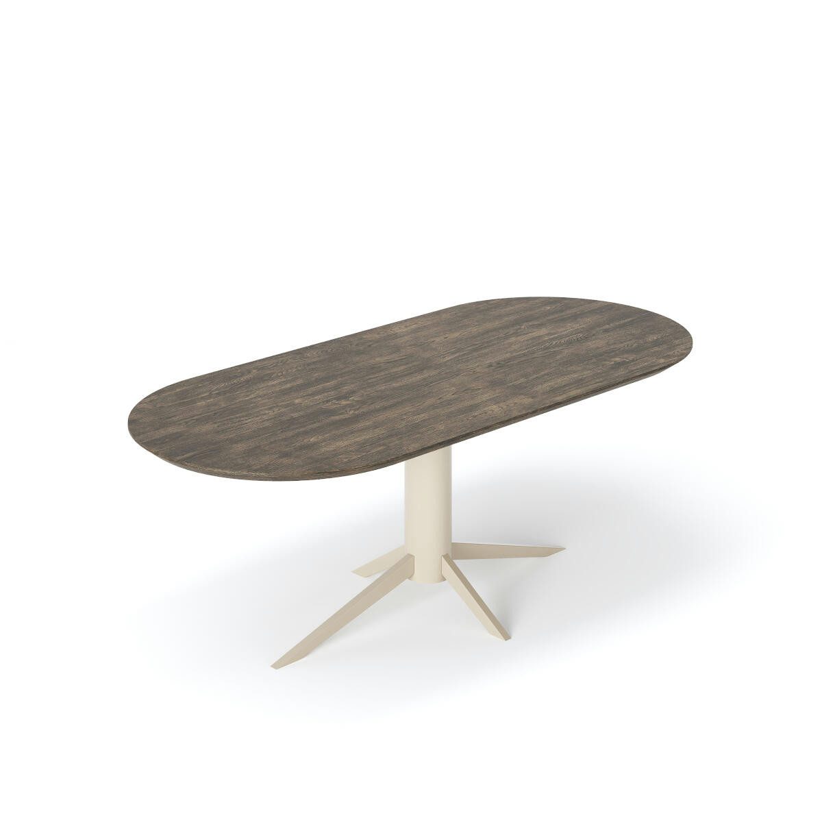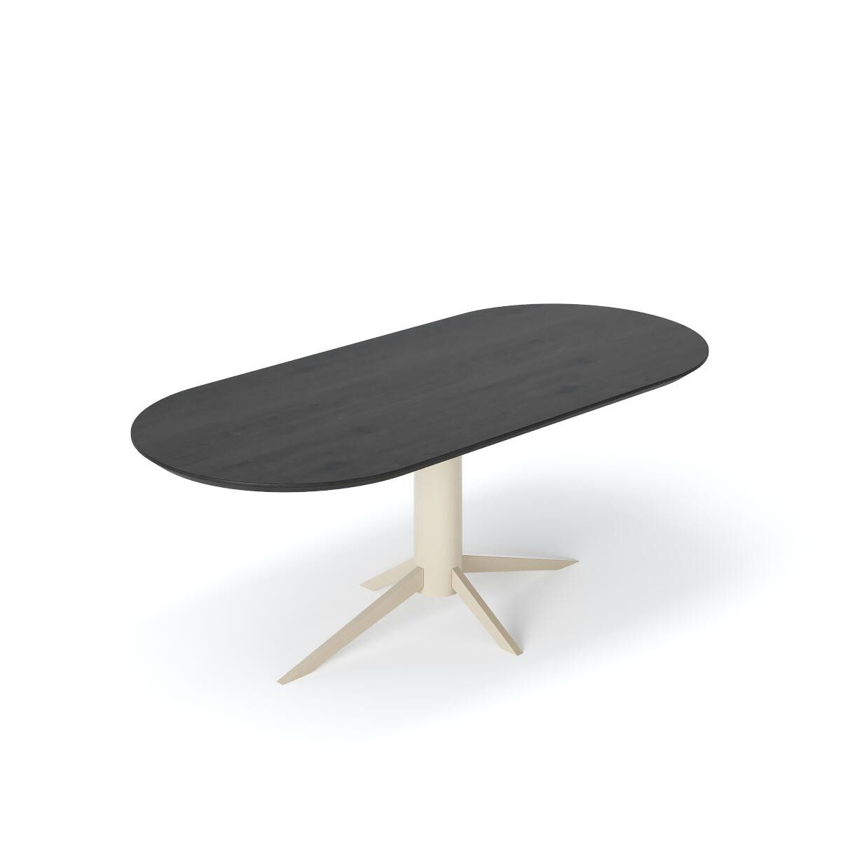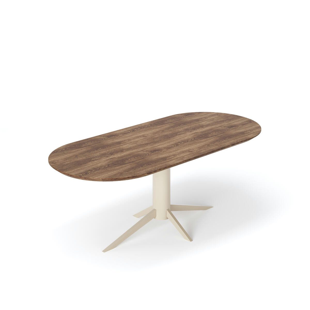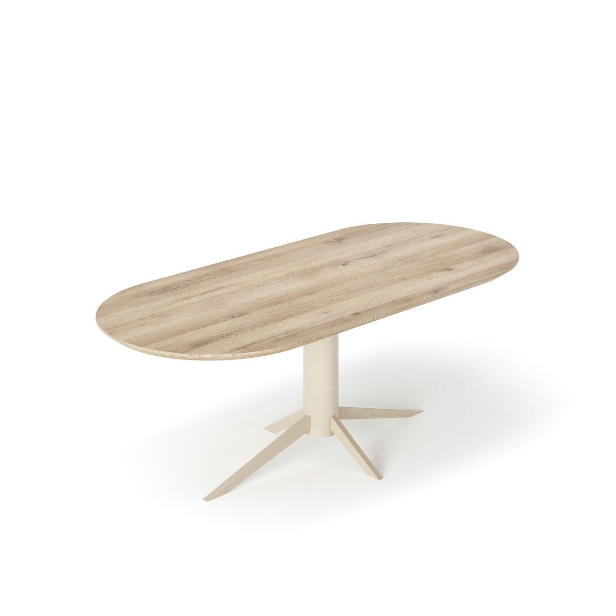Der Tisch Lykke verbindet modernes skandinavisches Design mit der zeitlosen Schönheit von massiver Wildeiche. Die sanfte Pilleform verleiht dem Tisch eine harmonische Eleganz, während das beige 4-Bein-Gestell aus pulverbeschichtetem Stahl für einen stabilen Stand sorgt.