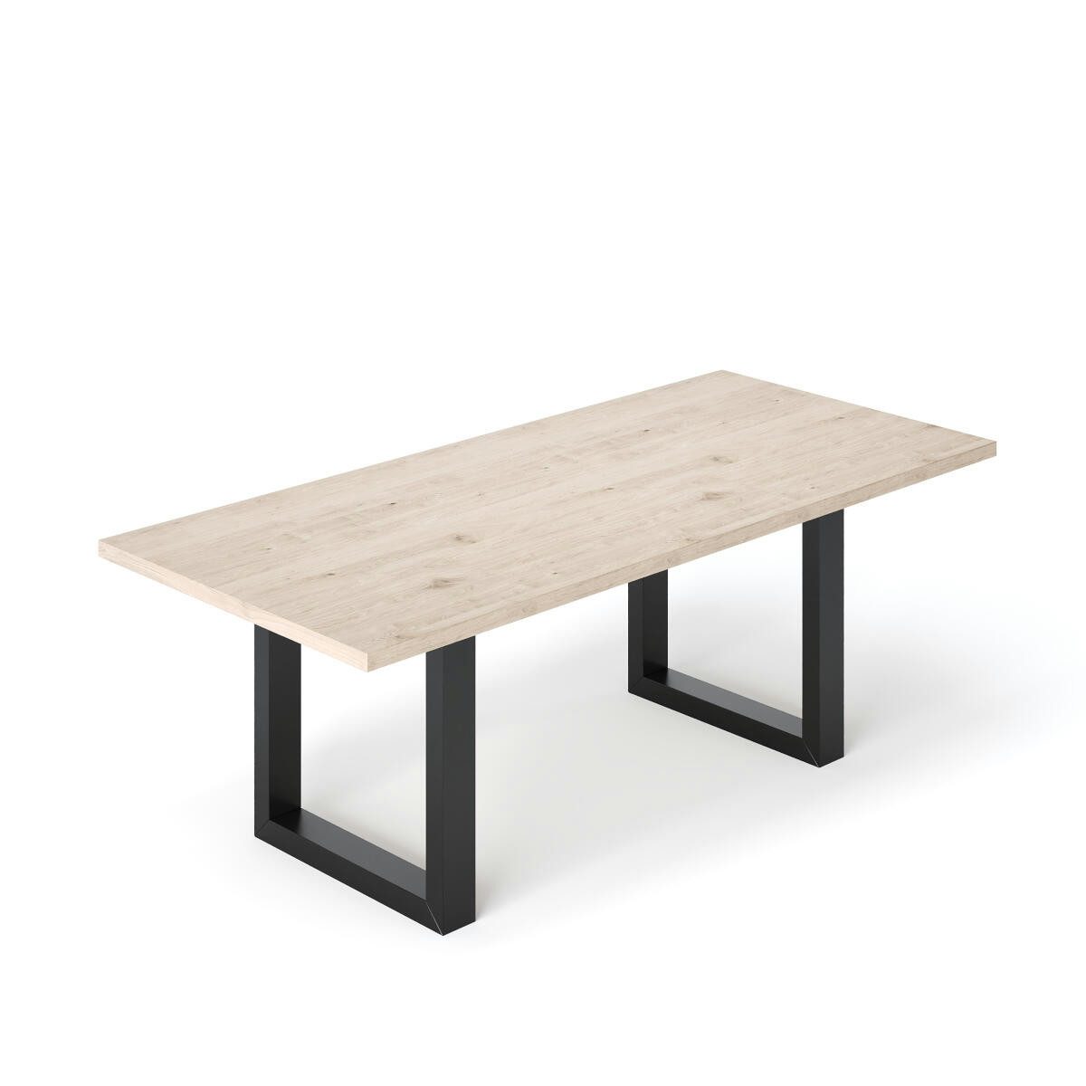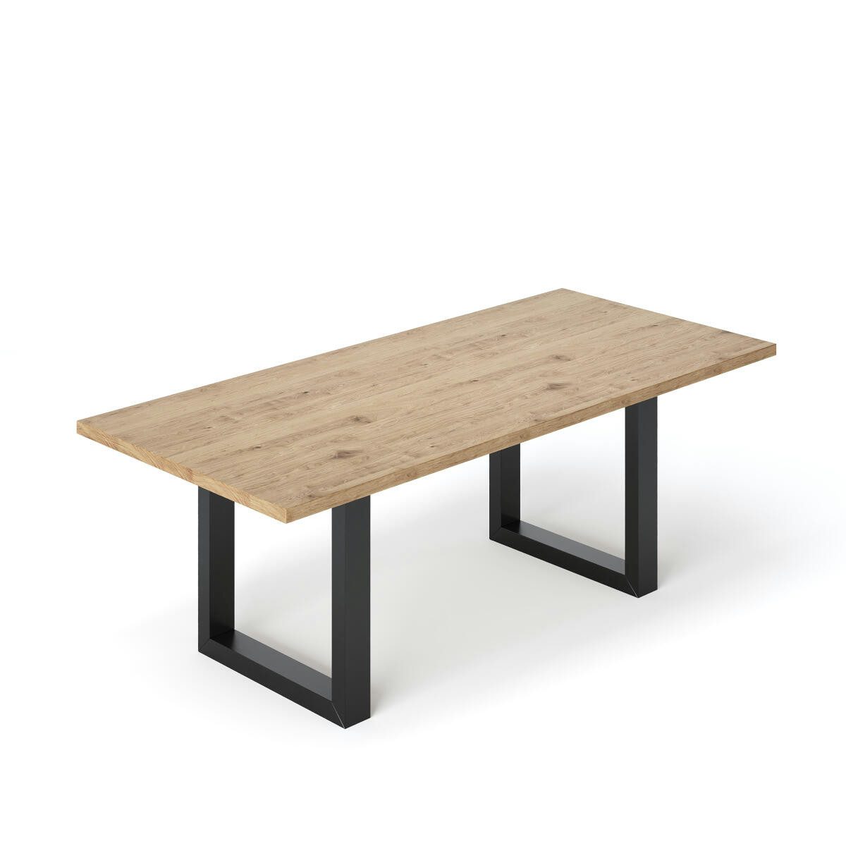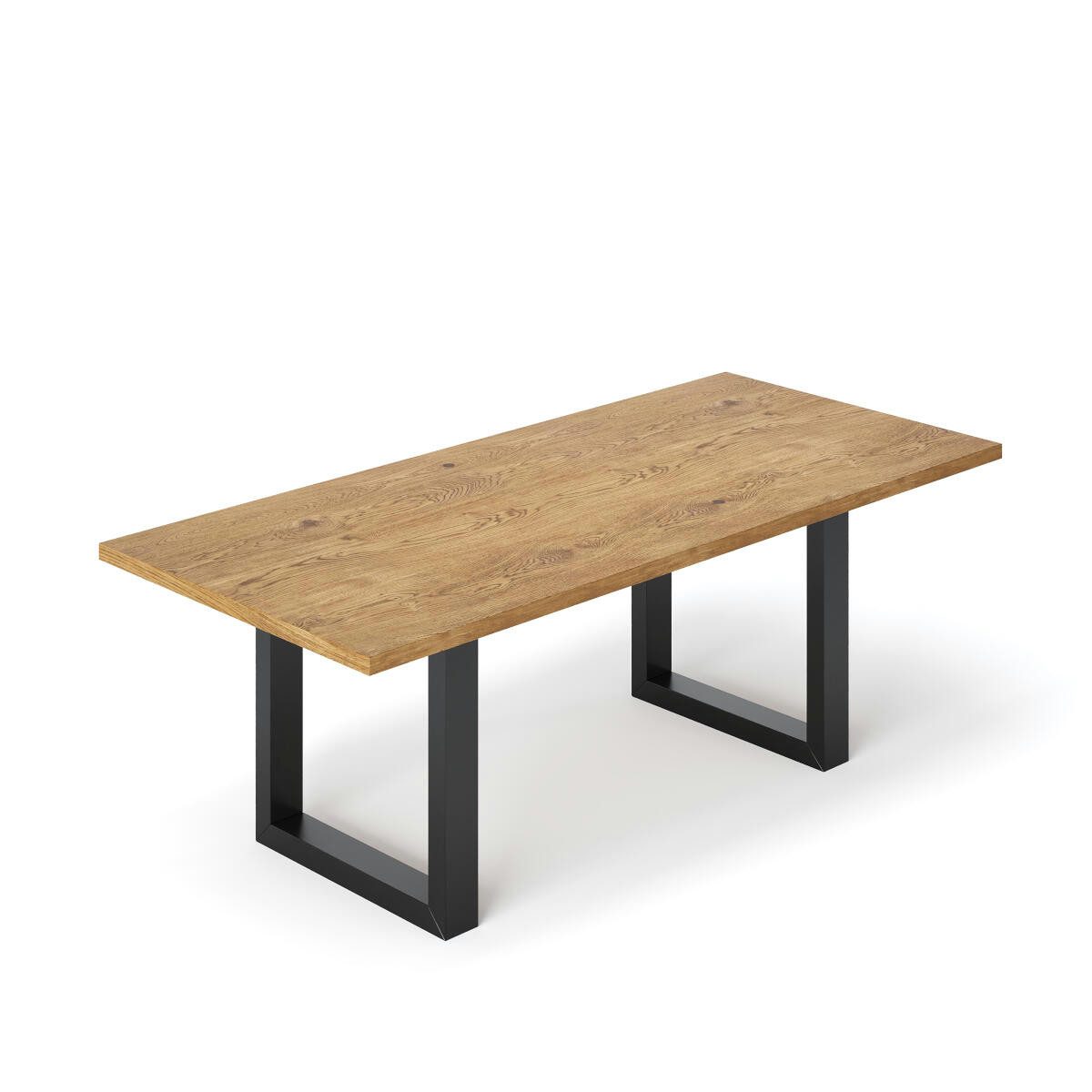 Der massive Esstisch Steffi überzeugt durch seine gradlinige Form, die natürliche Schönheit der Eiche und ein stabiles U-Gestell aus schwarzem Stahl. Ein echtes Statement-Möbel für moderne Wohnräume.