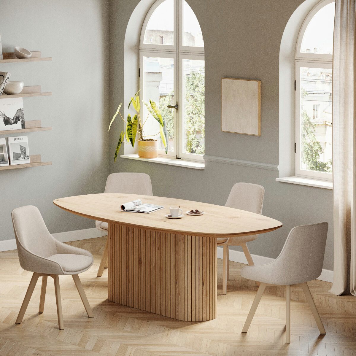 Mit Длинаn zwischen 160 und 300 cm eignet sich der Küchentisch sowohl für kleinere Essbereiche als auch für großzügige Wohnbereiche, in denen viele Personen Platz finden. Das minimalistische, rechteckige Eichenholz-Gestell verleiht ihm einen stabilen Stand, der den eleganten Charakter unterstreicht, und fügt sich durch das rechteckige Design optimal in moderne Wohnstile ein.