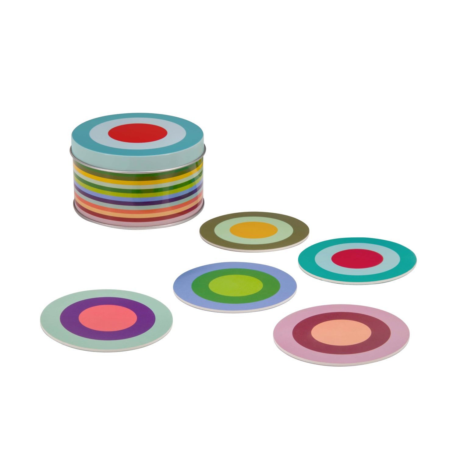Schutz vor unschönen Wasserflecken auf der Tischoberfläche bieten die Untersetzer aus dem Set Ronda von Remember. Die hübschen Untersetzer bringen Farbe auf den Tisch und können dank der laminierten Oberfläche mit einem feuchten Tuch gereinigt und mehrfach verwendet werden. Sie bestehen aus robuster Pappe, sind lebensmittelecht und sollten trocken gelagert werden und nicht länger mit Wasser in Kontakt kommen. Im Lieferumfang enhalten ist eine praktische Aufbewahrungsdose aus buntem Weißblech. Im Set enthalten sind 20 Untersetzer mit einem Durchmesser von jeweils 9,3 cm.