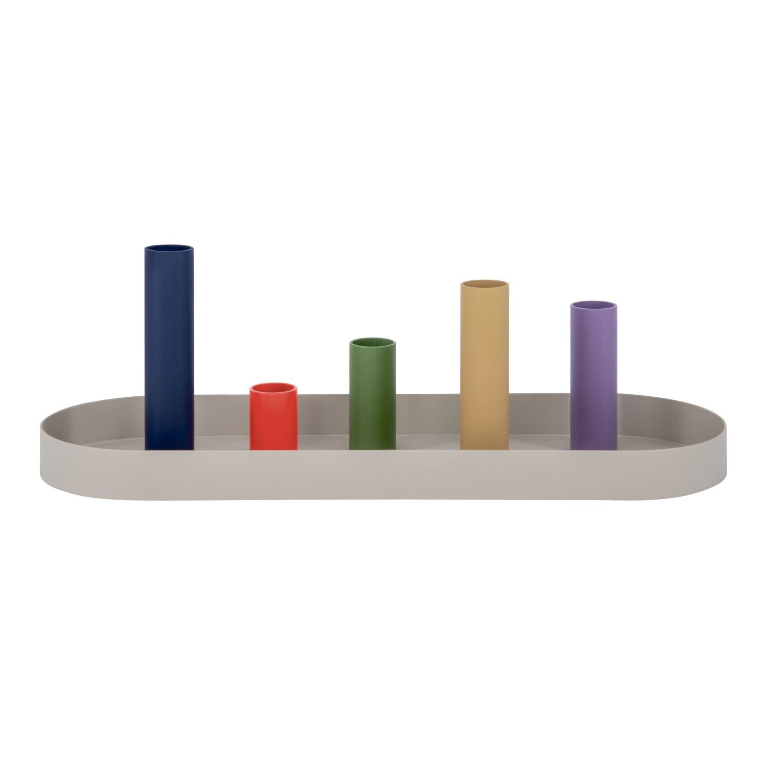 Der magnetische Kerzenhalter Luna von Remember ist nicht nur zu Weihnachten eine edle Dekoration: die fünf farbigen Kerzenhalter aus bunt beschichtetem Metall können auf dem schlichten Tablett immer wieder neu dekoriert werden. Durch seine ovale Form ist das Tablett ideal für einen Einsatz auf dem Fensterbrett geeignet. Dazu kann das Tablett je nach Jahreszeit ganz schlicht oder mit Nüssen, Kugeln und anderen Kleinigkeiten dekoriert werden. Zum Tablett mit einer Длина von 36 cm werden fünf Kerzenhalter in unterschiedlichen Größen geliefert (je 1x mit einer Höhe von 12 cm, 1 x 10 cm, 1 x 8 cm, 1 x 6 cm und 1 x 4 cm), die alle einen Durchmesser von 2,3 cm haben und so für Standard-Haushaltskerzen geeignet sind. Die Kerzenhalter werden von unsichtbaren Magneten sicher auf dem Tablett gehalten.