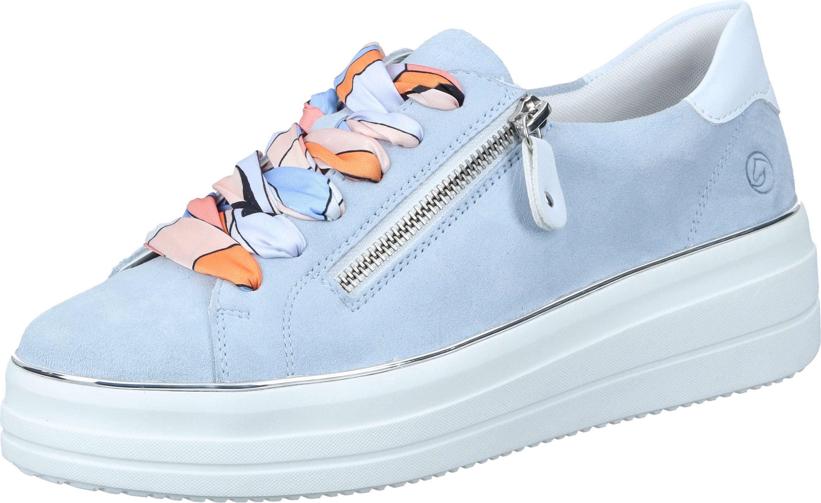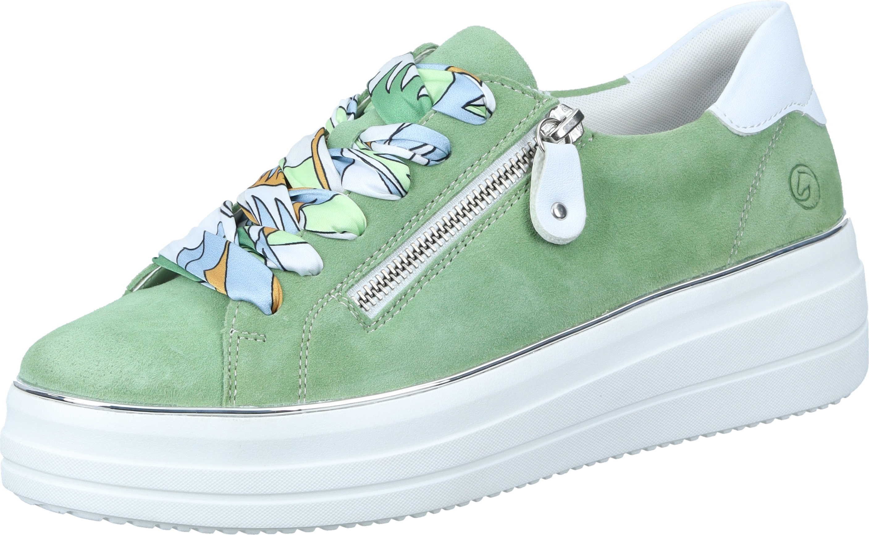 Die Remonte Damen Low Sneaker in grünem Rauleder setzen modische Akzente mit einer bunten Schnürung und einem praktischen Reißverschluss. Der verstärkte Fersenbereich sorgt für zusätzliche Stabilität und unterstützt den Fuß optimal. Ein gepolsterter Einstieg sorgt für hohen Tragekomfort, während das gepolsterte Wechselfußbett für zusätzlichen Komfort sorgt. Die Plateausohle mit leichtem Keil verleiht dem Sneaker nicht nur eine trendige Optik, sondern sorgt auch für eine angenehme Höhe und ein komfortables Laufgefühl. Ein ideales Modell, das sich vielseitig kombinieren lässt.