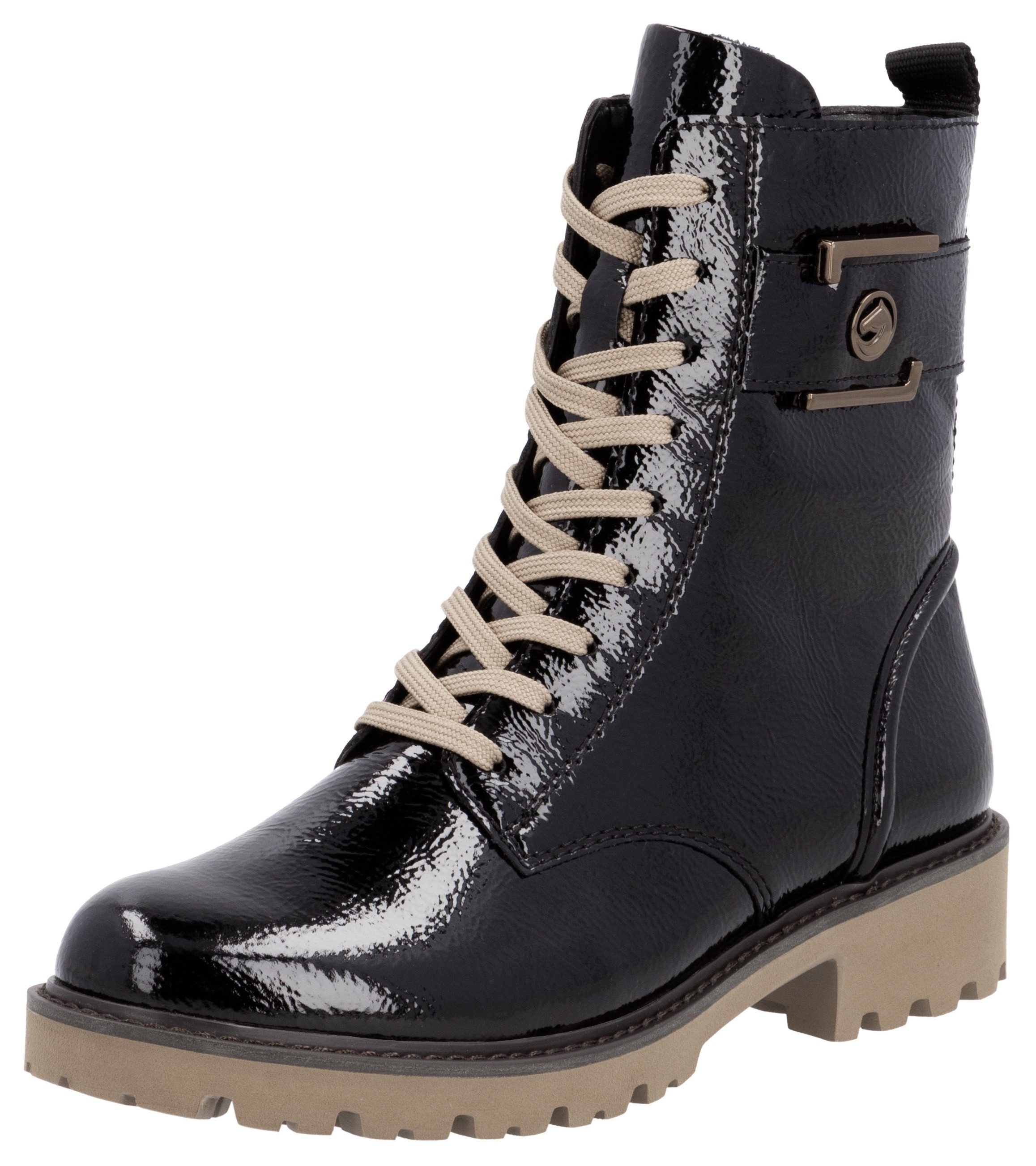 Das Obermaterial aus Lackleder ist glänzend und auffällig. Die Synthetik-Sohle der Schnürstiefeletten ist profiliert und sorgt nicht nur für einen lässigen Look, sondern auch für einen rutschfesten Auftritt. Die Innensohle aus Textil ist herausnehmbar und erlaubt damit individuelle Anpassungen mit Einlagen oder orthopädischen Sohlen. Dank dem Blockabsatz und der klassischen runden Schuhspitze sind die Schnürstiefeletten ideal für den Alltag und lange Tragezeiten. Mit ihrer Weite F bieten diese Schnürstiefeletten eine bequeme und passgenaue Form für schmale bis normale Füße.