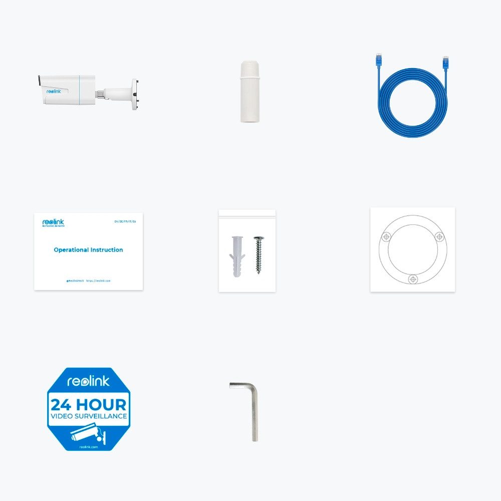 Lieferumfang | 1x P430, 1x 1m Network Cable, 1x Quick Start Guide, 1x Mounting Template, 1x Surveillance Sticker, 1x Waterproof Lid, 1x Pack of Screws, 1x Wrench |