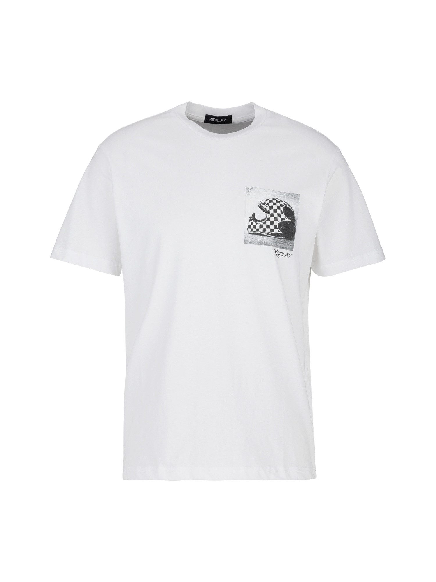 Dieses Replay Herren T-Shirt überzeugt durch sein cleanes Design mit einem markanten Grafikprint im Brustbereich. Der auffällige schwarz-weiße Print setzt ein modisches Statement und verleiht dem klassischen Basic-Shirt einen individuellen Look.