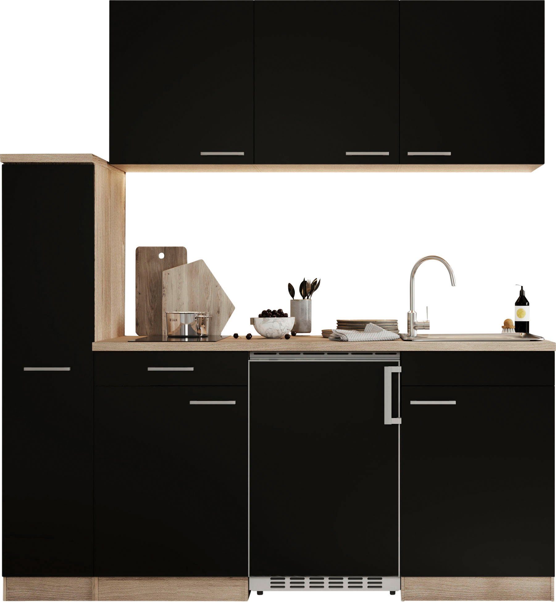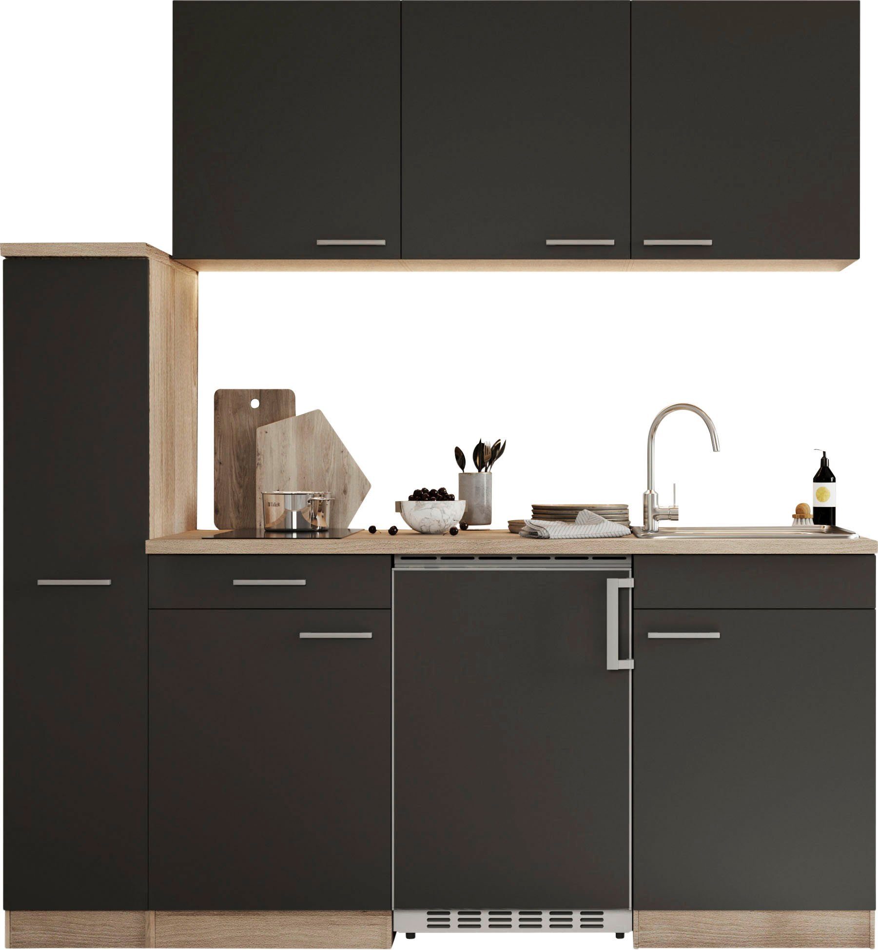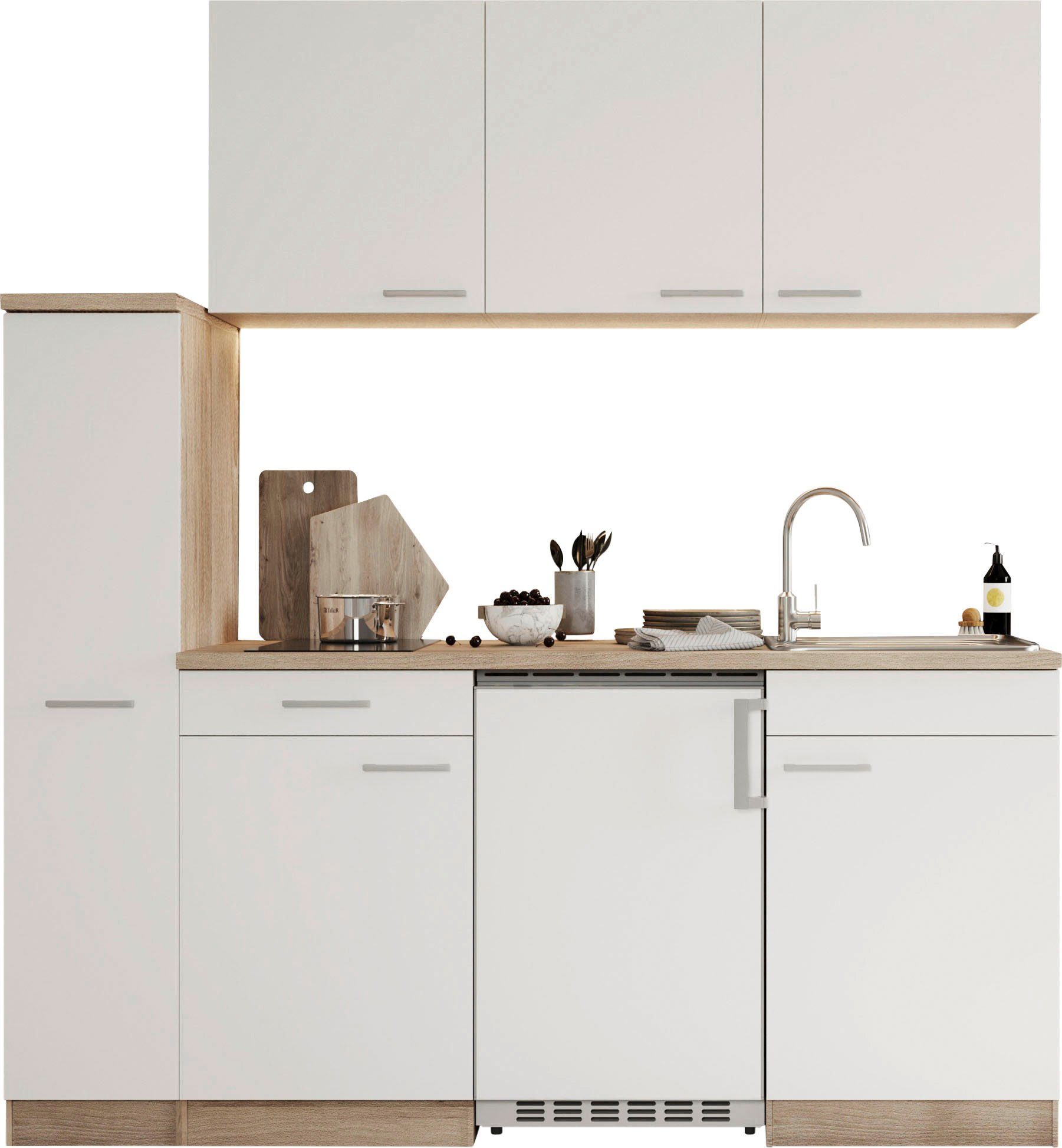 Ausstattung | Durchgehende Arbeitsplatte Seitenverkehrt stellbar Sockelhöhe nicht verstellbar inkl. Edelstahl-Einbauspüle, mit Abtropffläche mit E-Geräten |