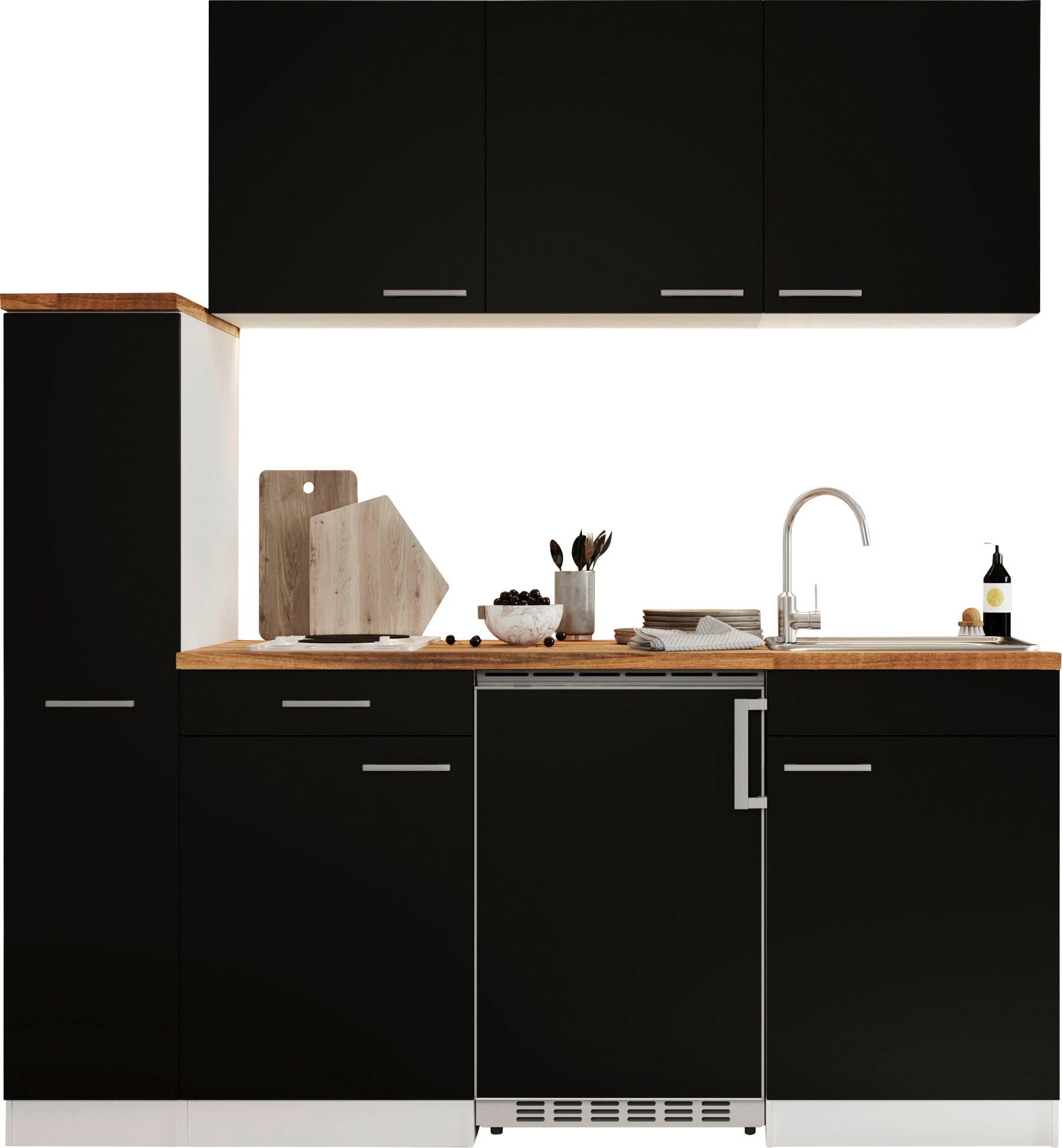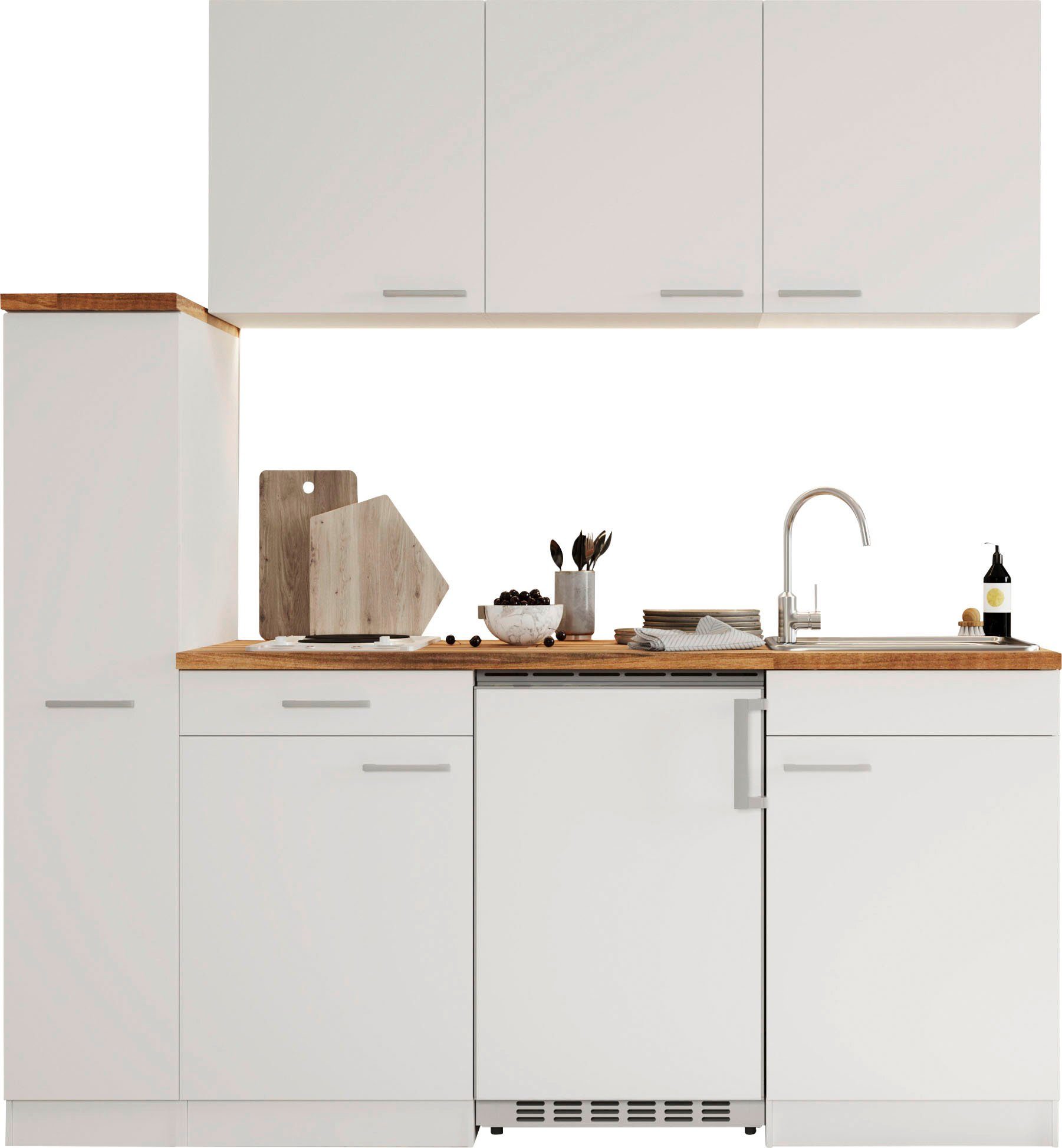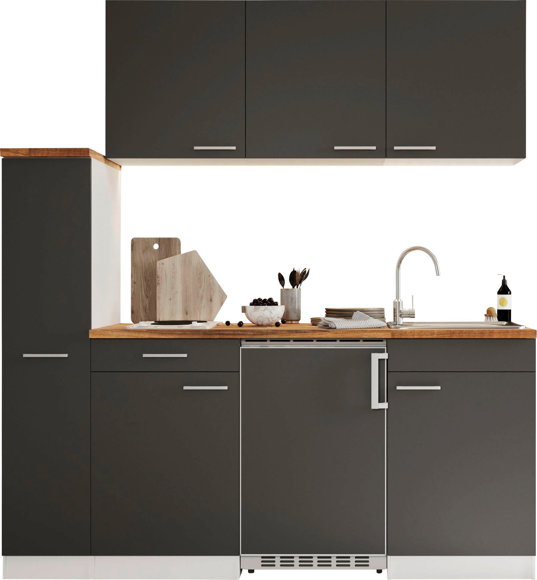 Ausstattung | Durchgehende Arbeitsplatte Seitenverkehrt stellbar Sockelhöhe nicht verstellbar inkl. Edelstahl-Einbauspüle, mit Abtropffläche mit E-Geräten |