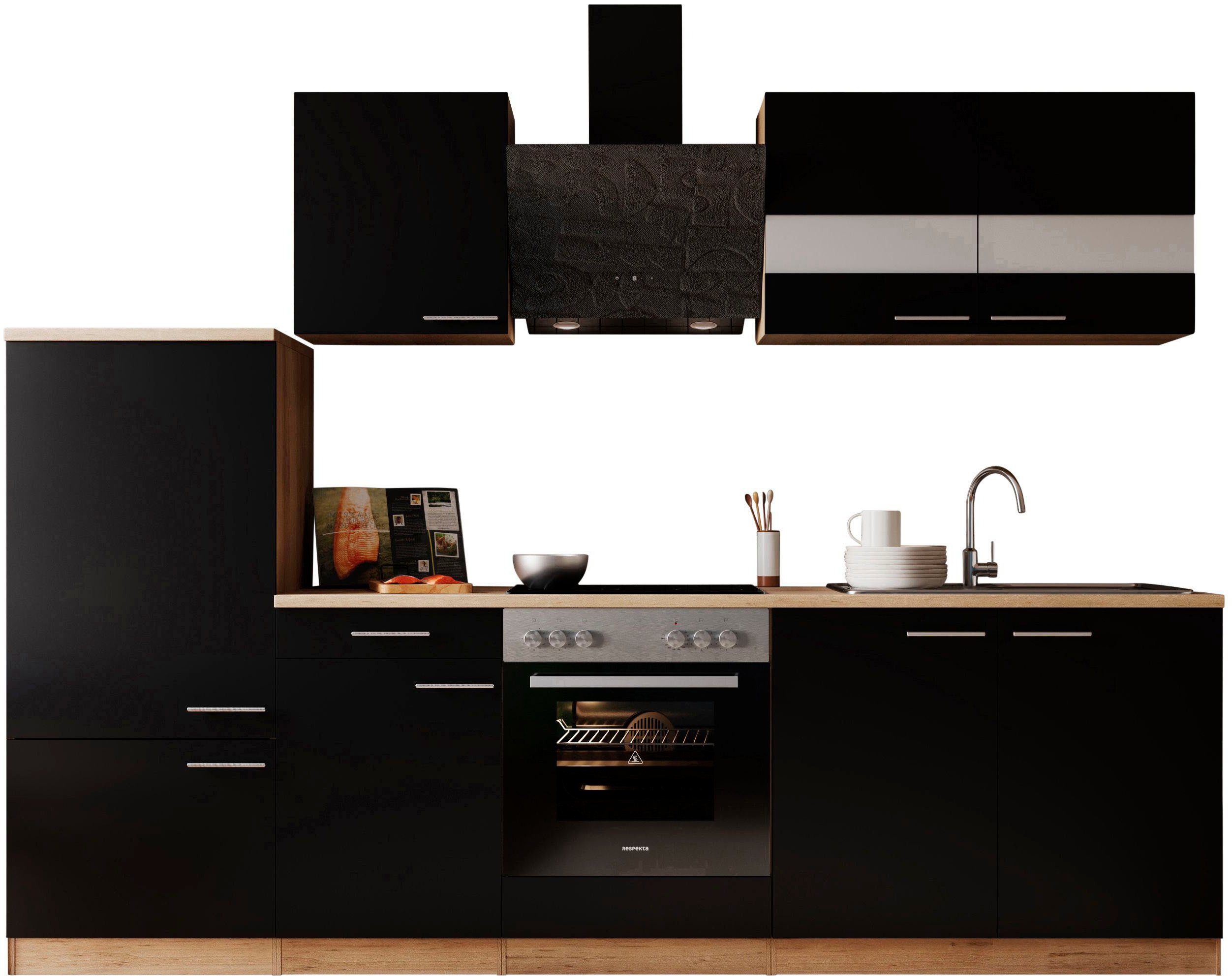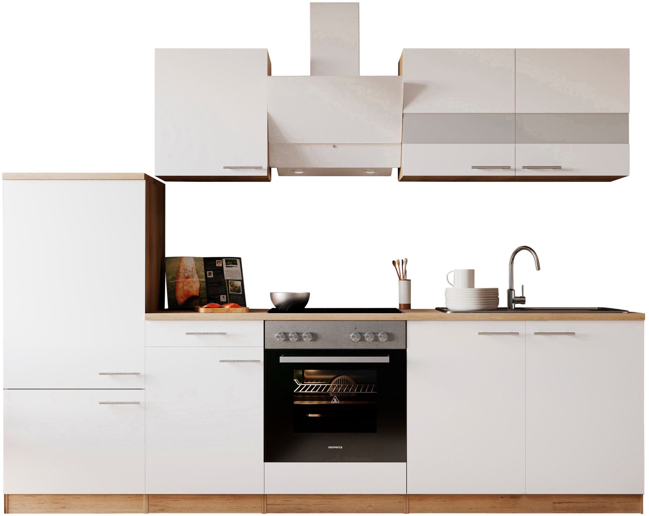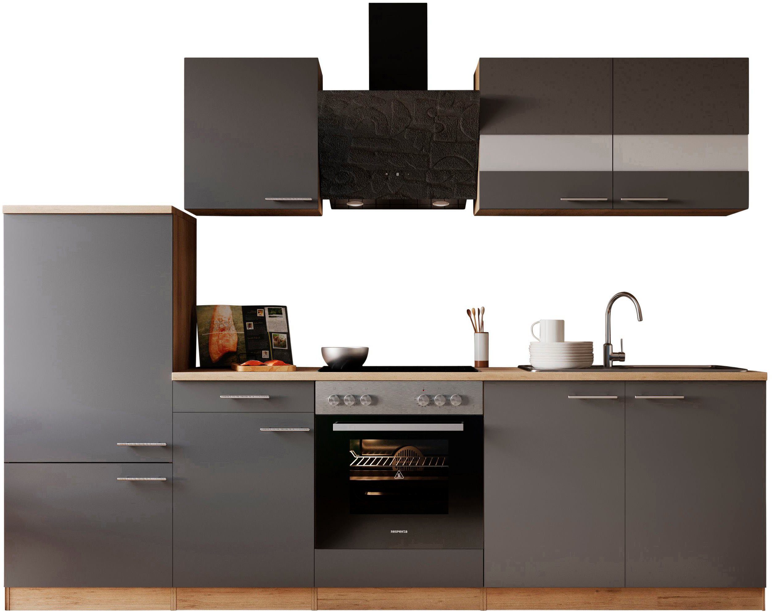 Ausstattung | Durchgehende Arbeitsplatte Seitenverkehrt stellbar Sockelhöhe nicht verstellbar inkl. Edelstahl-Einbauspüle, mit Abtropffläche mit E-Geräten |