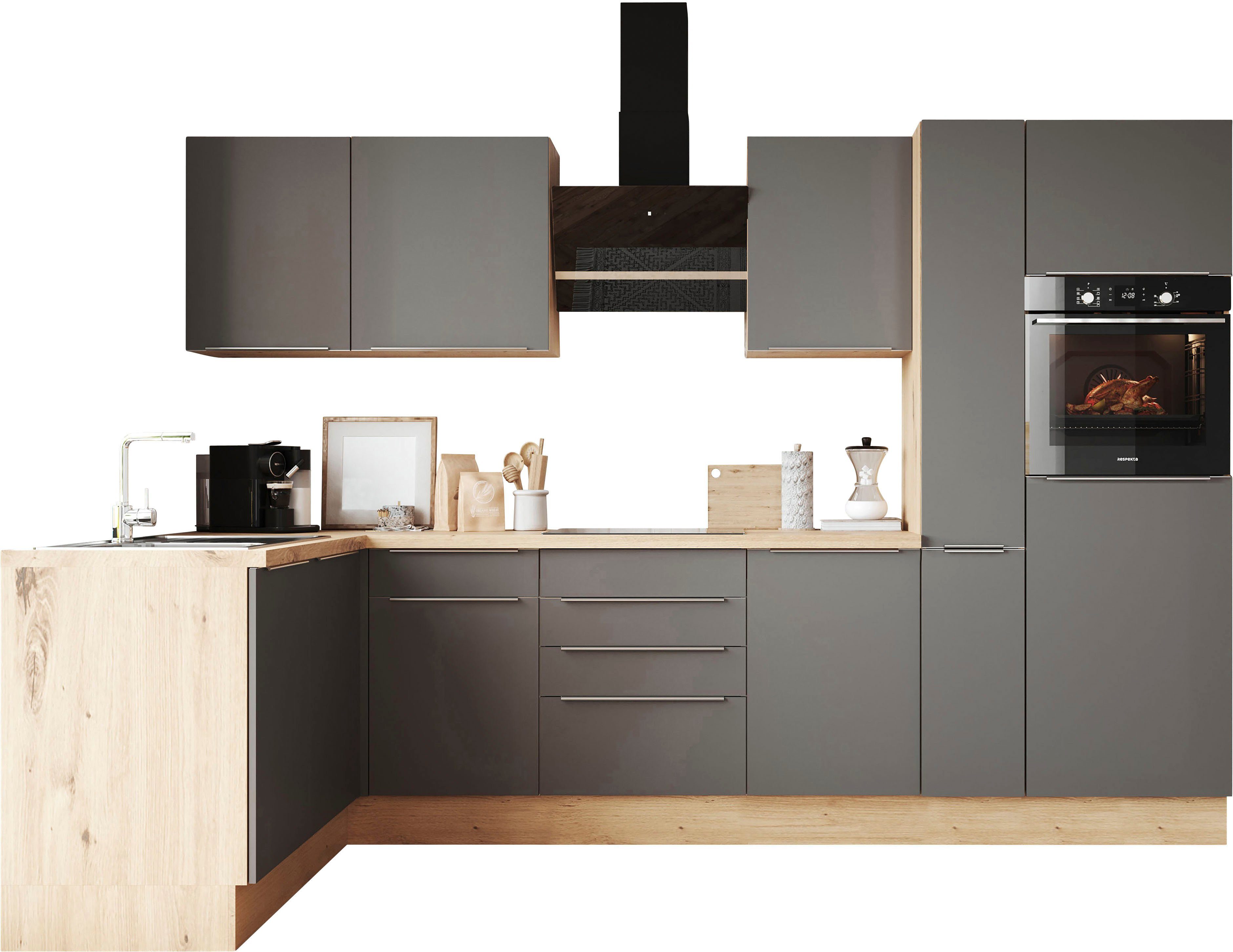 Ausstattung | Griffleiste Höhenverstellbare Füße Schubkästen und Türen mit Soft-Close-Funktion Türen wahlweise rechts/links montierbar inkl. Edelstahl-Auflagespüle, mit Abtropffläche |
