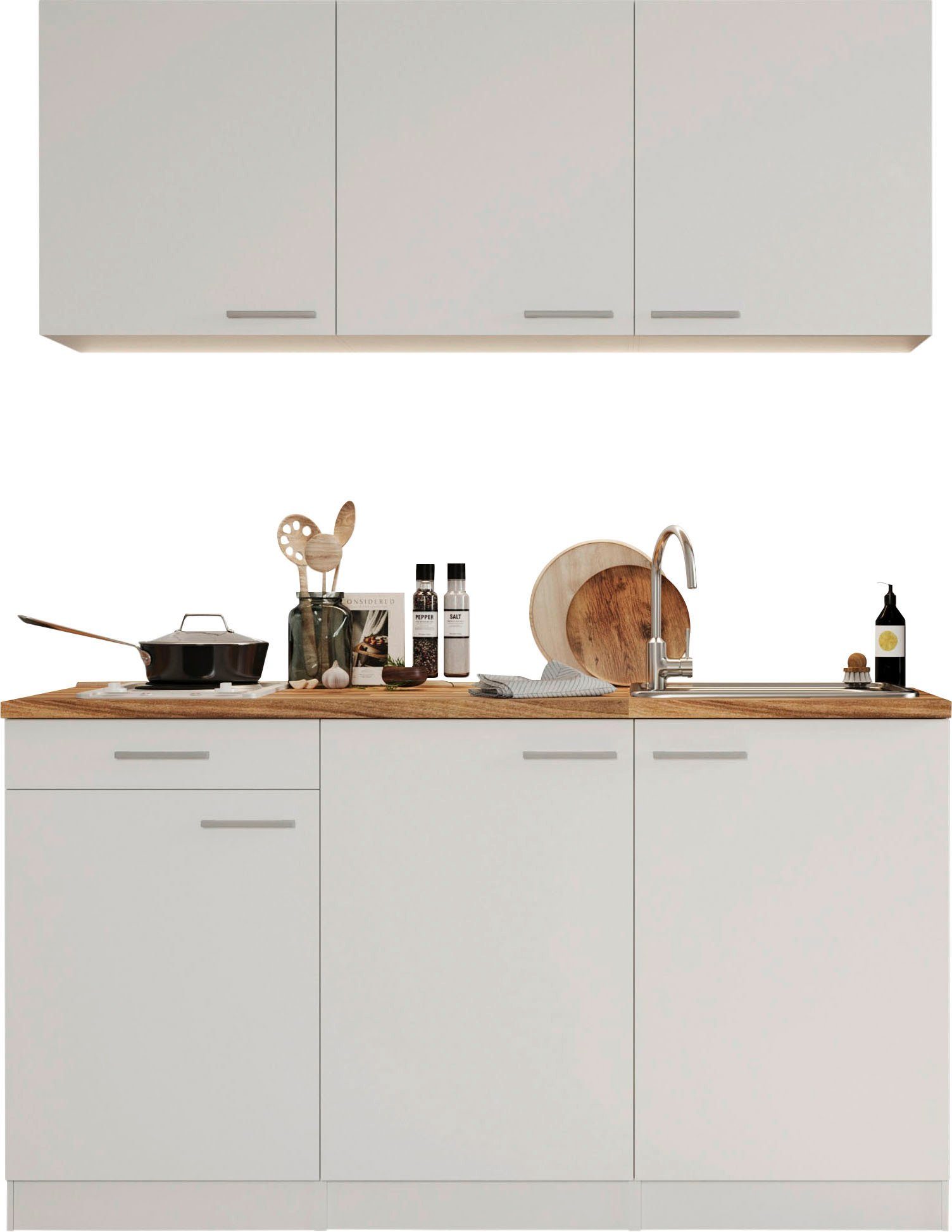 Ausstattung | Durchgehende Arbeitsplatte Seitenverkehrt stellbar Sockelhöhe nicht verstellbar inkl. Edelstahl-Einbauspüle, mit Abtropffläche mit E-Geräten |