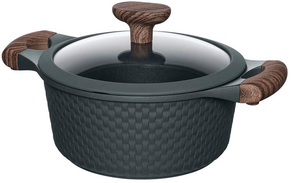 Funktionelles und stilvolles Kochgeschirr mit einem eleganten Muster, das an gewebte Stoffe erinnert.