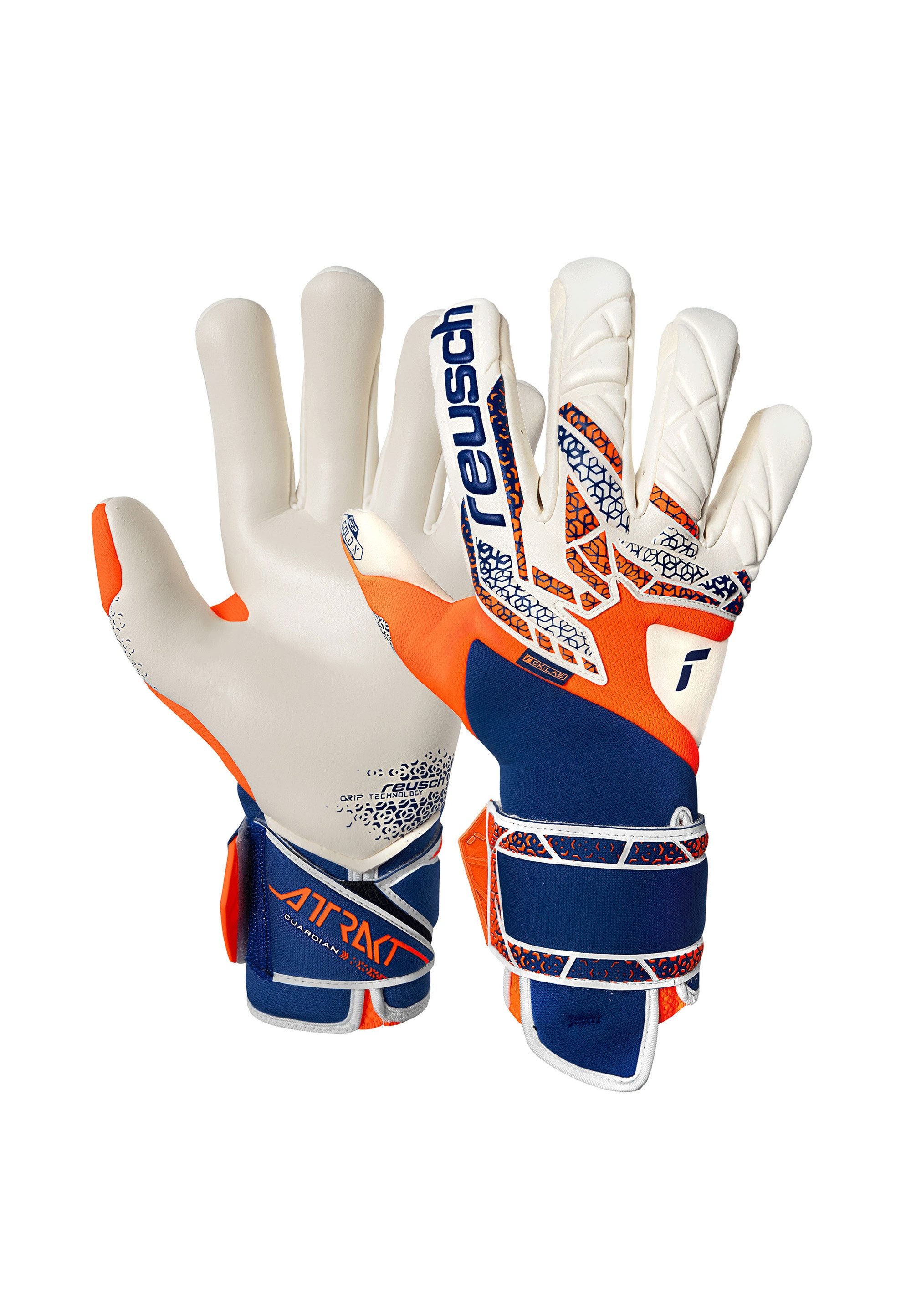 Reusch Attrakt Gold X Guardian - Dein ultimativer Profi-Handschuh! Vertraue auf die Wahl von Weltklasse-Torhütern wie Alisson Becker! Der Reusch Grip Gold X bietet dir maximalen Grip für absolute Kontrolle - egal ob bei trockenen oder nassen Bedingungen. Dank der engen Passform und der vergrößerten Latexfläche kannst du den Ball präzise und sicher greifen. Die Innennahtkonstruktion sorgt für eine anatomische, flexible Passform, während die vergrößerte Latexfläche bis in die Handfläche deinen Grip auf ein neues Level hebt. Strategisch platzierte Belüftungskanäle aus Neopren halten deine Hände kühl und trocken. Der anatomisch vorgeformte Schnitt mit leicht gespreizten Fingern unterstützt deine natürliche Griffhaltung. Die gerollte Daumenkonstruktion vermeidet störende Nähte und sorgt für mehr Komfort. Mit dem adaptiven Flex-Verschlusssystem genießt du sicheren Sitz und maximale Bewegungsfreiheit. Hol dir den Reusch Attrakt Gold X Guardian und beherrsche dein Tor wie ein Profi!