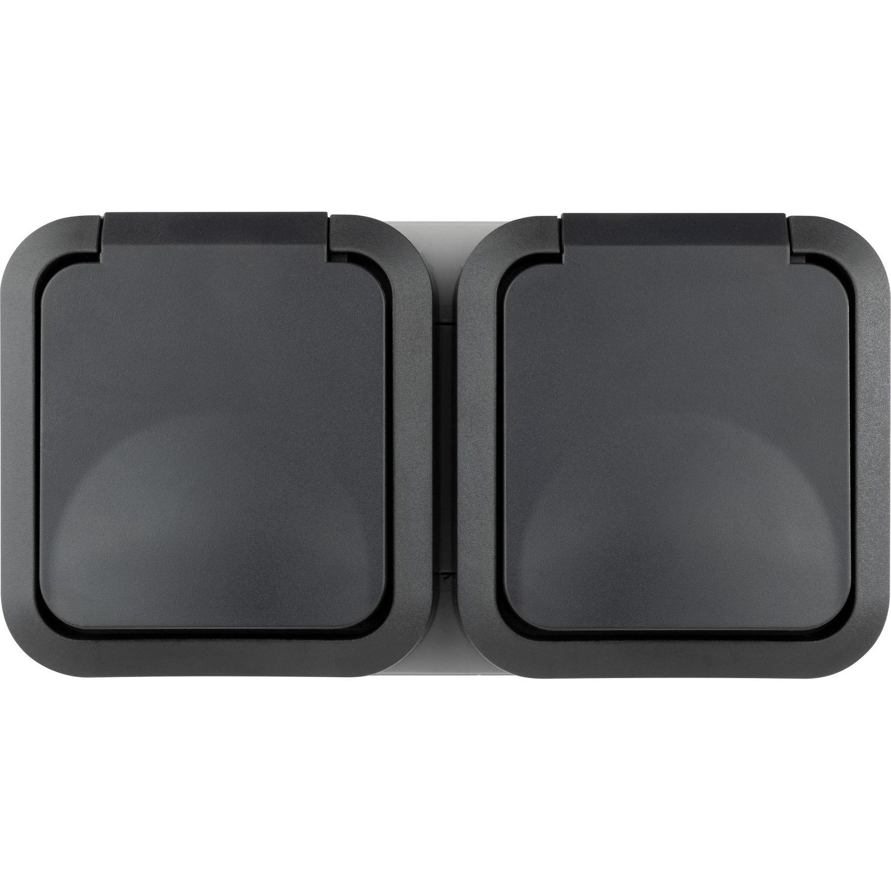 Aufputz-Feuchtraum 2-fach Schutzkontakt-Steckdose im Design STANDARD und der Farbe dunkelgrau mit Klappdeckel in waagerechter Ausführung.