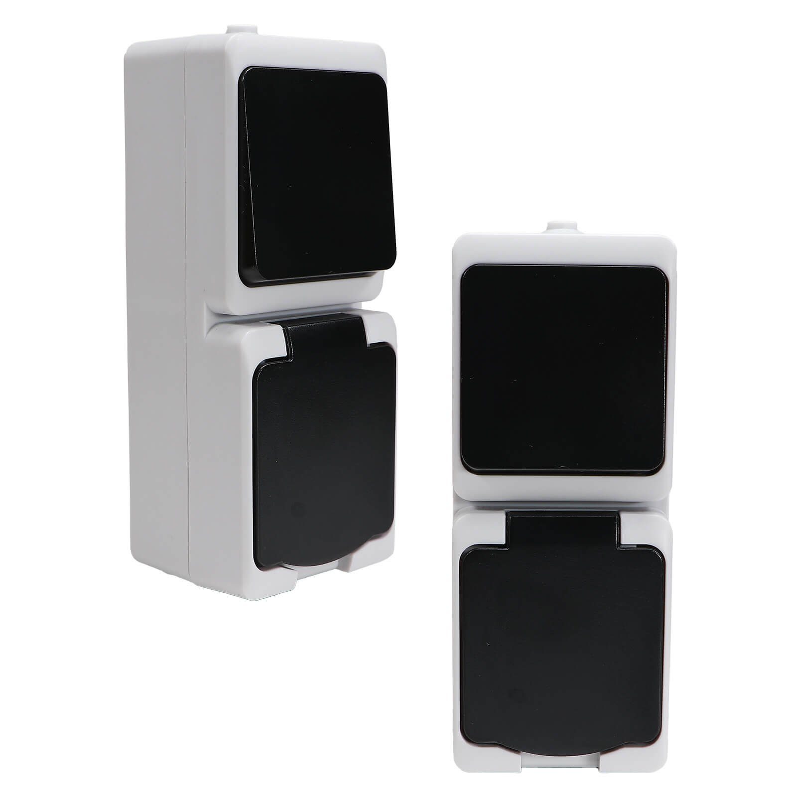 KOMPATIBEL - 2-fach Kombination Aus-/Wechselschalter und Steckdose senkrecht kombinierbar mit den Aufputz-Feuchtraum Schaltern und Steckdosen AquaMini für eine individuelle Raumgestaltung im und rund ums Haus