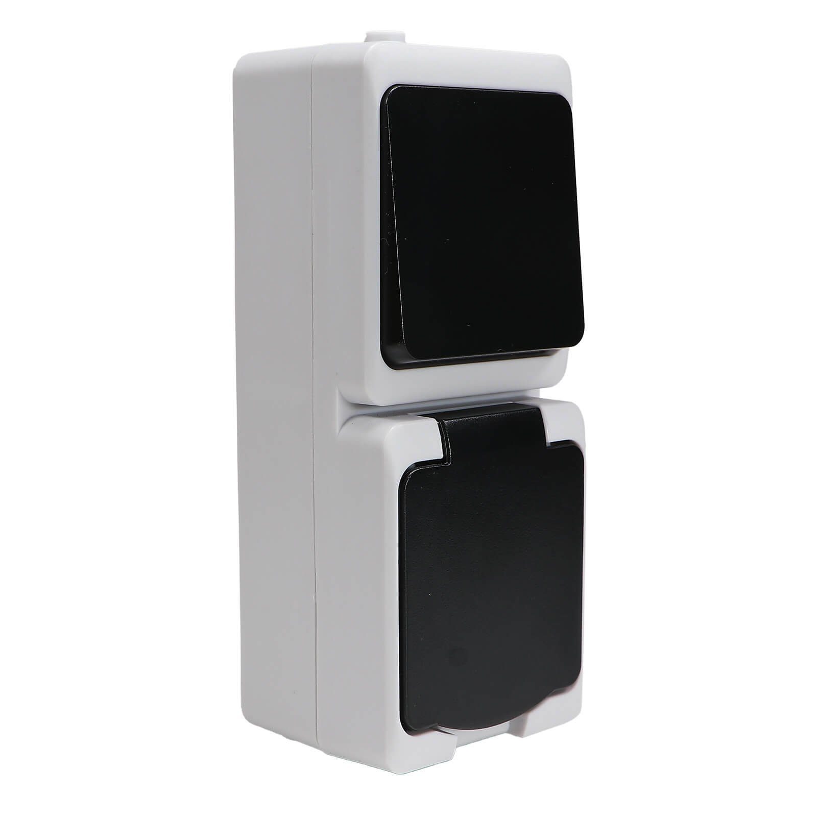 KOMPATIBEL - 2-fach Kombination Aus-/Wechselschalter und Steckdose senkrecht kombinierbar mit den Aufputz-Feuchtraum Schaltern und Steckdosen AquaMini für eine individuelle Raumgestaltung im und rund ums Haus