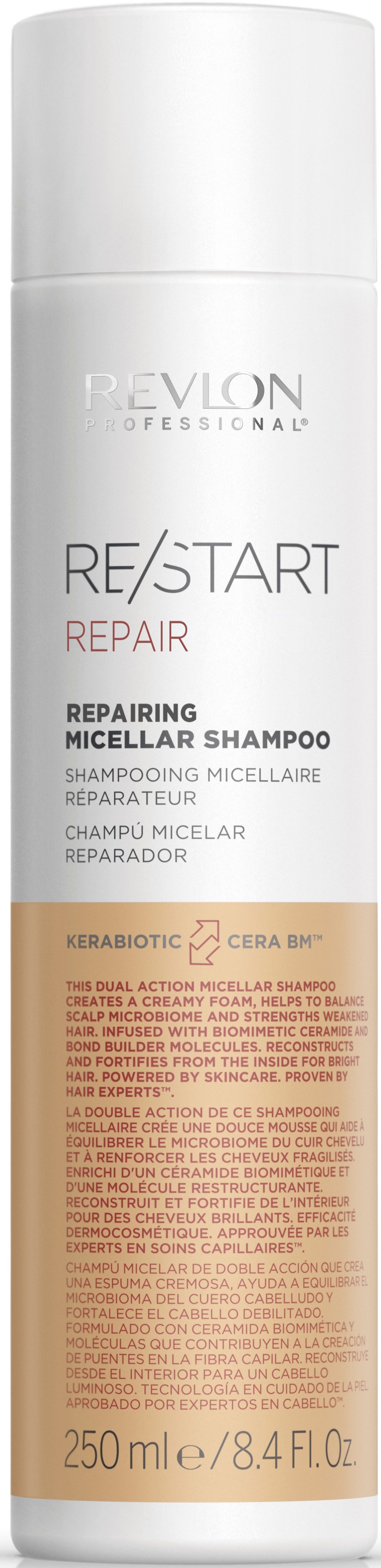 RE/START Repairing Micellar Shampoo (250 ml): Mit diesem Haarshampoo verwöhnen Sie Ihr Haar mit einem doppelwirksamen Haar- und Kopfhautsystem. Das KERABIOTIC SYSTEM kombiniert bewährte Wirkstoffe der Hautpflege mit modernsten Haarpflege-Lösungen. Die besondere Formel des Mizellen-Shampoos verleiht Ihnen ein angenehmes Haargefühl und sorgt in Kombination mit den anderen Recovery-Produkten für 2x stärkeres Haar. Das RE/START Recovery Restorative Micellar Shampoo ist speziell für geschädigtes Haar geeignet und ideal für alle, die Wert auf ein strahlendes Aussehen legen. Der cremige Schaum enthält Bond-Builder-Moleküle, die das Haar von innen stärken und reparieren, während biomimetische Ceramide dafür sorgen, dass die Haaroberfläche versiegelt ist. Sorgen Sie für ein natürliches Gleichgewicht des Kopfhaut-Mikrobioms bei gleichzeitiger Regeneration der Haarstruktur und stärkerer Leuchtkraft des Haars. Einfach das Shampoo sanft ins nasse Haar einarbeiten und gründlich ausspülen. RE/START – RETHINK HAIRCARE. Das Produkt besitzt folgende Eigenschaften: » Mizellen-Shampoo mit Zweifachwirkung » für Reparatur & Aufbau » 250 ml Flasche » von Haarexperten weiterentwickelt » für geschädigtes Haar. Es ist Zeit für einen Neustart – mit RE/START – der Start für modernste Haarpflege-Technologien. Basierend auf bewährter Hautpflege sind alle Haarpflegeprodukte von RE/START von Haarexperten weiterentwickelt und speziell auf die besonderen Bedürfnisse verschiedener Haartypen zugeschnitten. Eine vitale, gesunde Kopfhaut ist immer eine Voraussetzung für schönes Haar. So wird zum einen das Kopfhaut-Mikrobiom in ein natürliches Gleichgewicht gebracht, zum anderen werden die Haarfasern versiegelt und spezifische Bedürfnisse des Haares behandelt: Feuchtigkeit, Farbschutz, Aufbau und Volumen. Mit RE/START gehen auch Sie neue Wege und wagen einen Neustart für Ihr Haar.