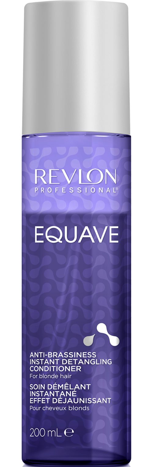 Revlon Professional Equave™ kombiniert wirkungsvoll das Entwirren der Haare mit Rezepturen zum Schutz und zur spezifischen Pflege unterschiedlicher Haartypen. Das Меню einfach anzuwendender Leave-in Conditioner ermöglicht so individuelle Pflegelösungen. Unser professioneller Zwei-Phasen Leave-in Conditioner Equave™ Anti-Brassiness entwirrt das Haar sofort, wirkt wie ein Primer für das Haar und ist somit der erste Schritt in Ihrer Haarpflegeroutine für blondes, weißes, gesträhntes oder blondiertes Haar. Der Leave-in Conditioner hat eine leichte Zwei-Phasen Formel, die unerwünschte Gelbtöne neutralisiert, die bei blondem, weißem und blondiertem Haar auftreten können. Das Haar lässt sich sofort 9x leichter entwirren, während eine hohe Konzentration violetter Pigmente unerwünschte warme Untertöne beseitigt und für frische, kühle Farbtöne sorgt. Mit der von Experten entwickelten Kinetic Technology™ des Leave-in Conditioners trifft Bewegung auf Innovation. Durch Schütteln der Zwei-Phasen Leave-in Sprühkur vermischen sich die beiden Phasen miteinander, um das Haar sofort zu entwirren und Gelbstich zu neutralisieren. Schütteln. Einsprühen. Entwirren. Der Leave-in Conditioner kann auf das feuchte oder trockene Haar aufgesprüht werden, ganz einfach, ohne ausspülen. Das entwirrte Haar wird 89 % geschmeidiger, Gelbtöne werden neutralisiert und statisches Aufladen gebändigt. Die Leave-in-Spülung für blondes, weißes und blondiertes Haar bietet außerdem einen Hitzeschutz bis zu 220°. Für einen zusätzlichen Neutralisierungseffekt auf das trockene Haar auftragen. Aus einem Abstand von etwa 20 cm auf das Haar sprühen.