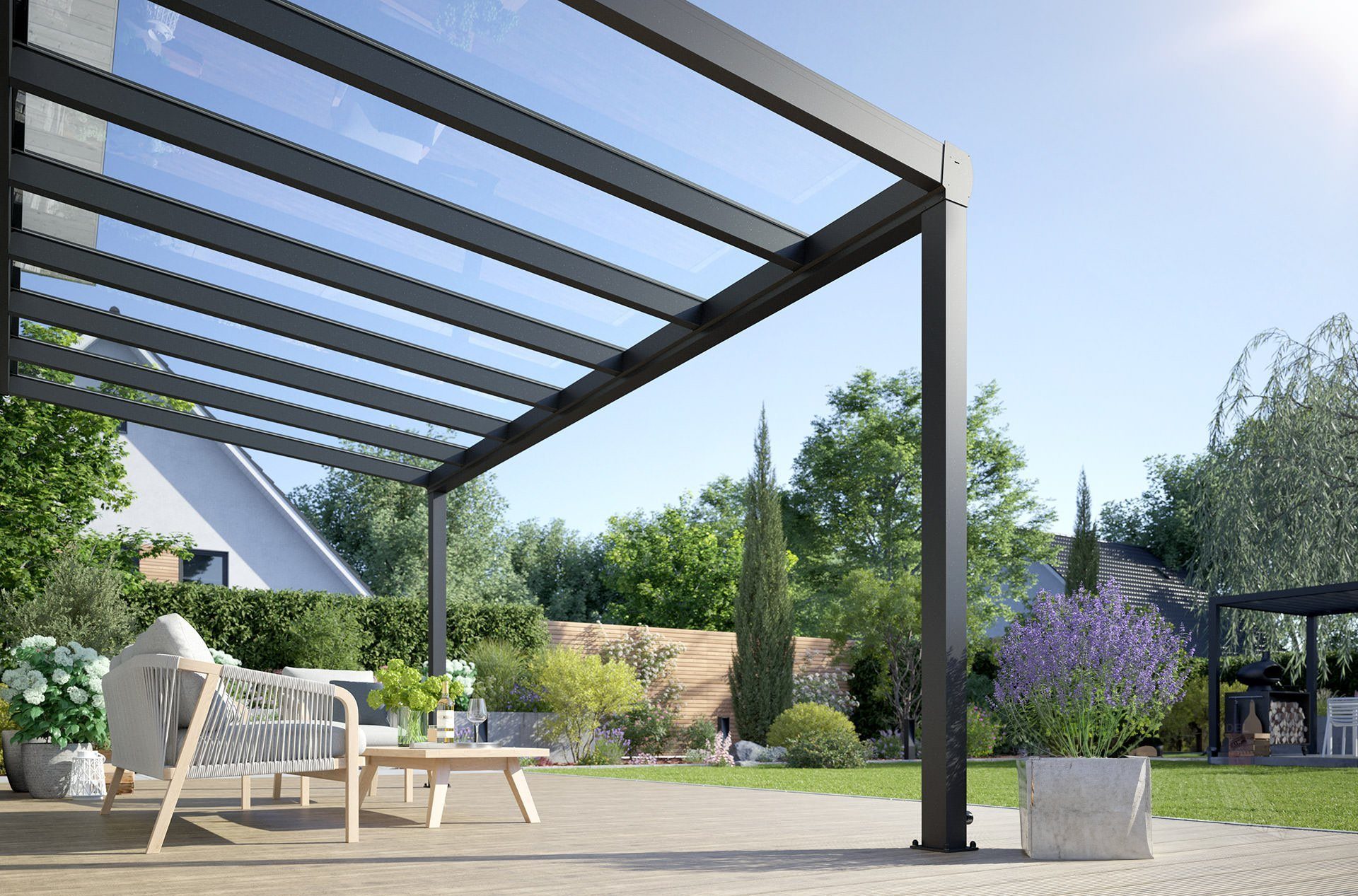 Verwandeln Sie Ihren Garten in ein Ganzjahresparadies mit der exklusiven REXOpremium® Terrassenüberdachung. Diese innovative Überdachung aus Deutschland, mit den Maßen 4m x 2,5m, bietet Ihnen die Wahl zwischen klarer 8mm VSG-Glasüberdachung und grauer 8mm VSG-Glasüberdachung, die beide eine robuste Aluminiumunterkonstruktion besitzen.