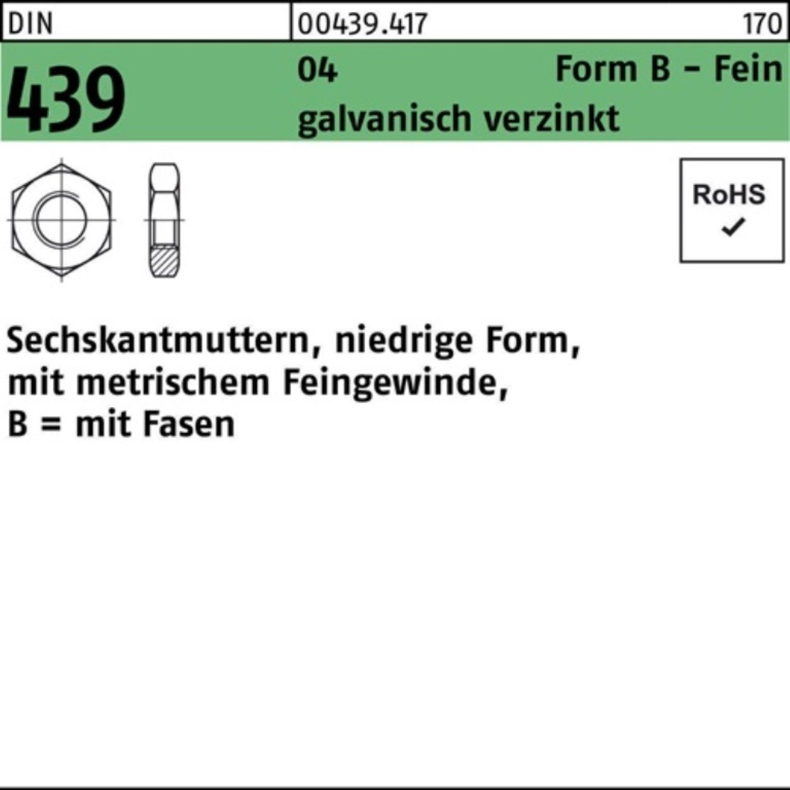 Sechskantmutter DIN 439/ISO 4035 FormB BM 8x1 Automatenstahl galv.verz. 100St. DIN 439 04 Form B - Fein galvanisch verzinkt Sechskantmuttern · niedrige Form · mit metrischem Feingewinde · mit Fasen - Abmessung: BM 8 x 1 VE=S (100 Stück) Впередe technische Eigenschaften: · Gruppencode: 00439.417
