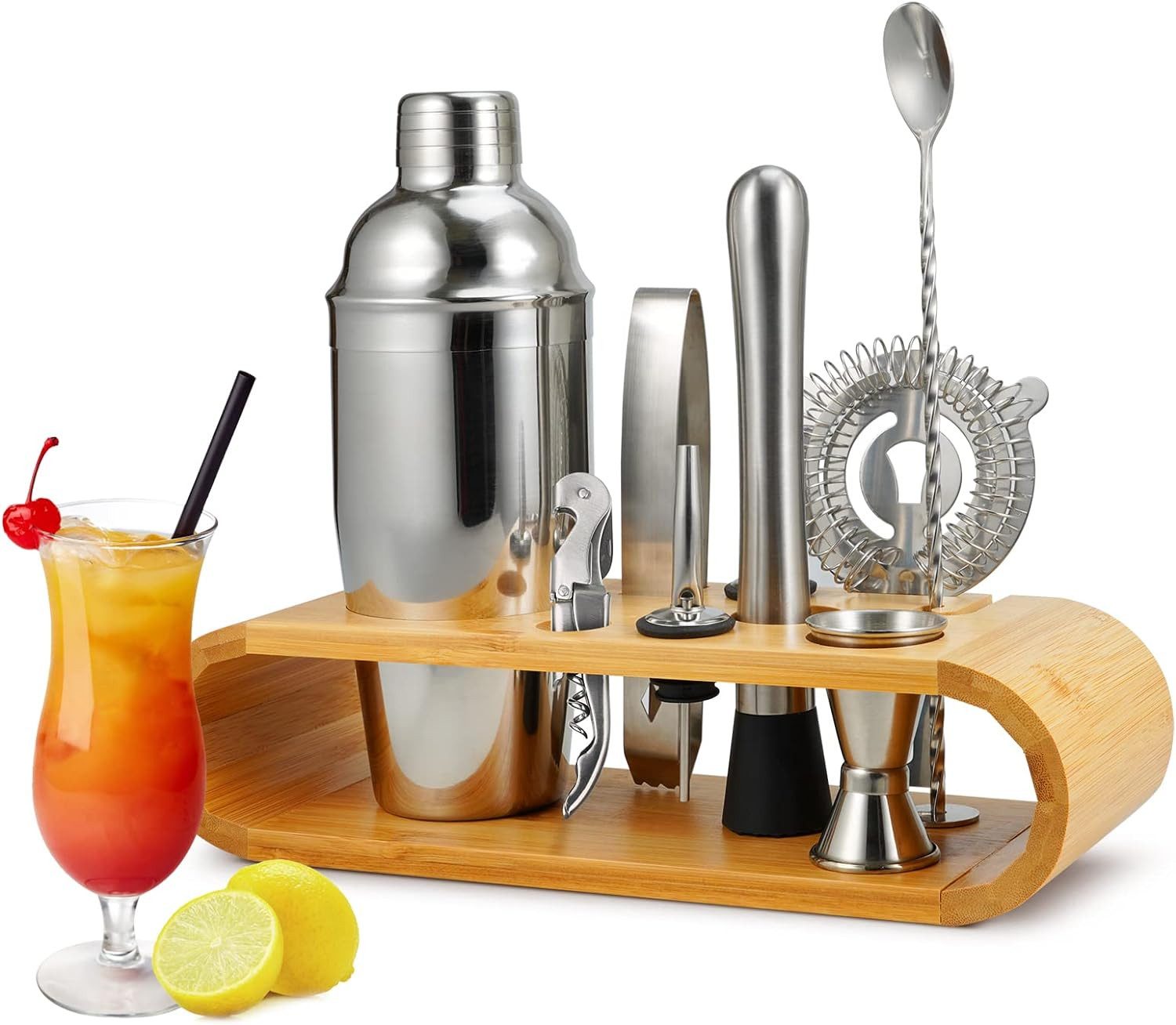 Das Set besteht aus einem 750ml Shaker mit integriertem Sieb, einem Messbecher, 2 Ausgießern, Barstößel, Barmesser & -löffel, einem Flaschenöffner, Eiszange, Eissieb und einem Bambusständer, der alle Teile ordentlich und dekorativ aufbewahrt. Dank durchdachter Anordnung ist alles griffbereit und stilvoll präsentiert.