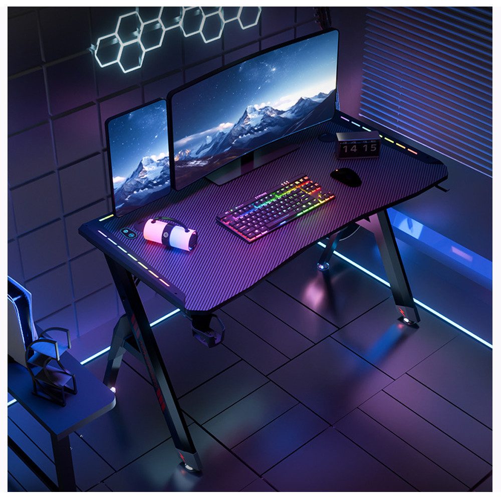 Der RHEIN BELEUCHTUNG Gaming-Schreibtisch 140x60 cm wurde speziell für Gamer und Technikliebhaber entwickelt. Sein robuster Stahlrahmen, die ergonomische Carbon-Oberfläche und die stilvolle RGB-Beleuchtung verbinden Funktionalität mit moderner Ästhetik. Mit ausreichend Platz für mehrere Monitore, einer Beinfreiheit von 73 cm und einer praktischen Ausstattung wie Becherhalter und Headset-Haken bleibt Ihr Setup stets organisiert und komfortabel.