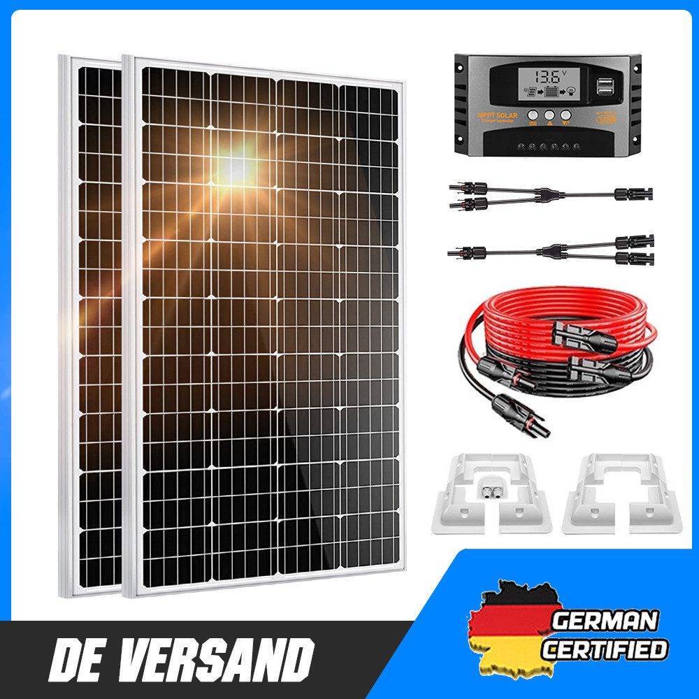 Lieferumfang | 2× 100W Monokristallin-Panels 1× 40A MPPT-Solarladeregler (12V/24V automatisch) 1 Paar 3 m MC4-Verlängerungskabel 1 Paar Y-Stecker (1 auf 2) 1× Wohnmobil-Halterungs-Set |