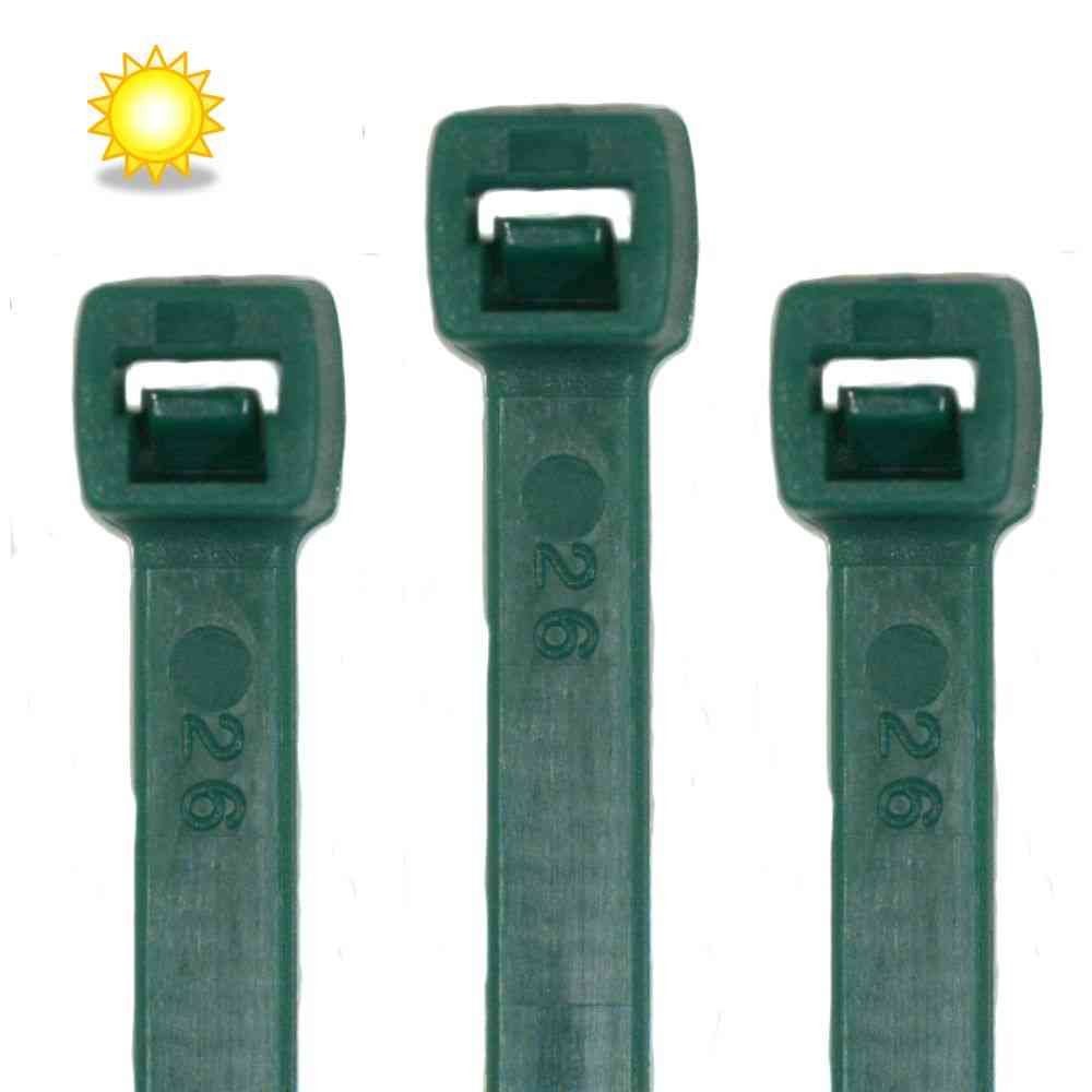 Kabelbinder UV Solar High UV Resist Kabelbinder UV Solar UV Stabilisiert Grün RAL 6005 RheVeTec RheFLEX®R2 Kabelbinder PA 6.6 UV Eigenschaften: Verfügbare Abmessungen: 140 x 3,6 mm bis 250 x 7,6 mm Material: 100% Nylon Polyamid 6.6 (Halogenfrei) VE: 100 Stück unter Schutzatmosphäre verpackt Zugbelastung: 130 - 550 Nm (ca. 12- 50 Kg) 140 x 3,6 = 130 Nm 200 x 4,8 = 280 Nm 290 x 4,8 = 280 Nm 250 x 7,6 = 550 Nm Selbsterlöschend nach UL94 V2 Feuchtigkeitsabsorbation: 2,5% bei 50% relativer Feuchtigkeit Temperaturbereich: -40°C bis +85°C Maximal zulässiger Punkt: +110°C (kurzfristig) Schmelzpunkt: +250°C UV Beständig Farbe : RAL 6005 Ausgezeichnete Beständigkeit gegen Alkalien, Öle, Ölprodukte, Schmierfette, Chloratlösungsmittel. Begrenzte Beständigkeit gegen Säuren. Die verwendeten Farben sind cadmiumfrei. Sämtliche Rohstoffe sind physiologisch unbedenklich. Die Herstellung unterliegt der QS- Norm 9000