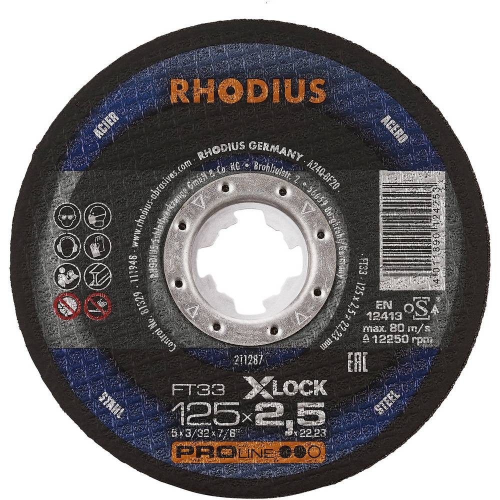 Maschineneignung: Die Trennscheibe FT33 X-LOCK ist im Handeinsatz für Winkelschleifer geeignet. Materialeignung: Die FT33 X-LOCK ist speziell für den Einsatz auf Stahl (Schwarzstahl auch Baustahl, St37, S235JR, 1.0037 oder Karbonstahl genannt) und Stahlguss abgestimmt. Aufbau und Herstellung: Die Trennscheibe enthält hochwertiges Korund (Aluminiumoxid) und 2 vollflächige Glasfasergewebe. Die Mindestseitenlast für die Trennscheibe beträgt nach EN 12413 und oSa 40 N. Im Bohrungsring ist das Verfallsdatum (drei Jahre) eingeprägt. Durch aufwendige In-Prozess-Kontrollen in der Produktion wird eine gleichbleibende Qualität gewährleistet. Um ein Maximum an Sicherheit zu bieten, wird jede tausendste Scheibe zerstörend getestet.Es handelt sich hier um eine Scheibe in gerader Form (Form 41). Trennscheiben mit gerader Form ermöglichen eine größere Eintauchtiefe und somit auch mehr Schnitte. Qualität: Der Anwender erhält mit der FT33 X-LOCK ein Werkzeug, das den hohen Qualitätsansprüchen in Industrie und Handwerk gerecht wird. Anwendung: In der Anwendung überzeugt die FT33 X-LOCK durch einen aggressiven Schnitt und eine hervorragende Laufruhe. Auch das präzise Arbeiten in dünnwandigem Material ist kein Problem. Mit dieser Trennscheibe lässt sich besonders wirtschaftlich arbeiten.Dieses RHODIUS Qualitätswerkzeug eignet sich besonders für das Trennen von Baustahl, Werkzeugstahl, hochlegiertem Stahl, Trägern, Profilen, Platten und Traversen. Abmessung: Die X-LOCK Freihandtrennscheibe mit einer Scheibenbreite von 2,5 mm ist in den Durchmessern 115 mm und 125 mm erhältlich und für Winkelschleifer unterschiedlichster Hersteller passend. Все RHODIUS Scheiben für X-LOCK sind zudem rückwärtskompatibel, das heißt: Sie können auch auf einem herkömmlichen Winkelschleifer mit Aufnahme für eine 22,23 Bohrung genutzt werden.