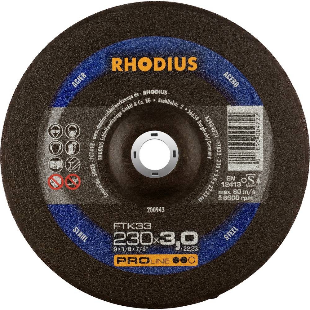 Maschineneignung: Die Trennscheibe FTK33 ,ist im Handeinsatz für Winkelschleifer sowie für Hochfrequenz- (HF) und Druckluftmaschinen aller Leistungsklassen geeignet. Materialeignung: Die FTK33 ist speziell für den Einsatz auf Stahl (Schwarzstahl auch Baustahl, St37, S235JR, 1.0037 oder Karbonstahl genannt) und Stahlguss abgestimmt. Aufbau und Herstellung: Die Trennscheibe enthält hochwertiges Korund (Aluminiumoxid) und 2 vollflächige Glasfasergewebe. Die Mindestseitenlast für die Trennscheibe beträgt nach EN 12413 und oSa 40 N, bzw. ab Durchmesser 150 mm 50 N. Im Bohrungsring ist das Verfallsdatum (drei Jahre) eingeprägt. Durch aufwendige In-Prozess-Kontrollen in der Produktion wird eine gleichbleibende Qualität gewährleistet. Um ein Maximum an Sicherheit zu bieten, wird jede tausendste Scheibe zerstörend getestet. Es handelt sich hier um eine Scheibe in gekröpfter Form (Form 42). Die Trennscheibe ist im Schnitt besonders stabil. Qualität: Der Anwender erhält mit der FTK33 ein Werkzeug, das den hohen Qualitätsansprüchen in Industrie und Handwerk gerecht wird. Anwendung: In der Anwendung überzeugt die FTK33 durch einen aggressiven Schnitt und eine hervorragende Laufruhe. Auch das präzise Arbeiten in dünnwandigem Material ist kein Problem. Mit dieser Trennscheibe lässt sich besonders wirtschaftlich arbeiten. Dieses RHODIUS Qualitätswerkzeug eignet sich besonders für das Trennen von Baustahl, Werkzeugstahl, hochlegiertem Stahl, Trägern, Profilen, Platten und Traversen. Abmessung: Die Freihandtrennscheibe mit einer Scheibenbreite von 2,0 mm und 3,0 mm ist in den Durchmessern 100 mm bis 230 mm erhältlich. Branchen: Sie ist das perfekte Werkzeug für die vielfältigen Anwendungen und Herausforderungen der Bauschlosser sowie im Anlagenbau, im Containerbau, in der Gießerei bzw. Putzerei, im Kessel- und Behälterbau, im Konstruktionsstahlbau, im Rohrleitungsbau und auch auf Montage..