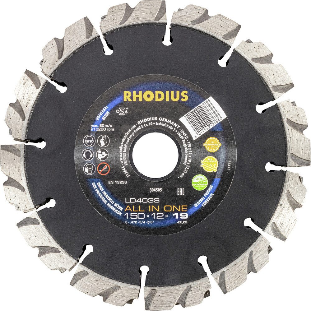 Maschineneignung: Die Diamantscheibe LD403 S ALL IN ON ist für den Handeinsatz mit der Mauerschlitzfräse geeignet. Insbesondere auf leistungsstarken Maschinen kann sie ihre Stärken voll ausspielen. Materialeignung: Die LD403S ALL IN ONE wurde gezielt für die Bearbeitung von harten Mauerziegeln, Beton, Pflasterklinkern, mittelharten Marmorziegeln, hartem Betonstein, Blocksteinen und Hohlblocksteinen entwickelt. Dieses RHODIUS Qualitätswerkzeug eignet sich zudem sehr gut für die Bearbeitung von hartem Kalksandstein und Sandstein. Aufbau und Herstellung: Die LD403S ALL IN ONE besitzt einen segmentierten Schneidrand. Somit wird eine sehr hohe Schnittgeschwindigkeit bei gleichzeitig maximaler Standzeit erreicht. Die Segmente sind zudem verschränkt angeordnet. Das Werkzeug ist nach EN13236 und oSa geprüft und kann im Trockenschnitt eingesetzt werden.