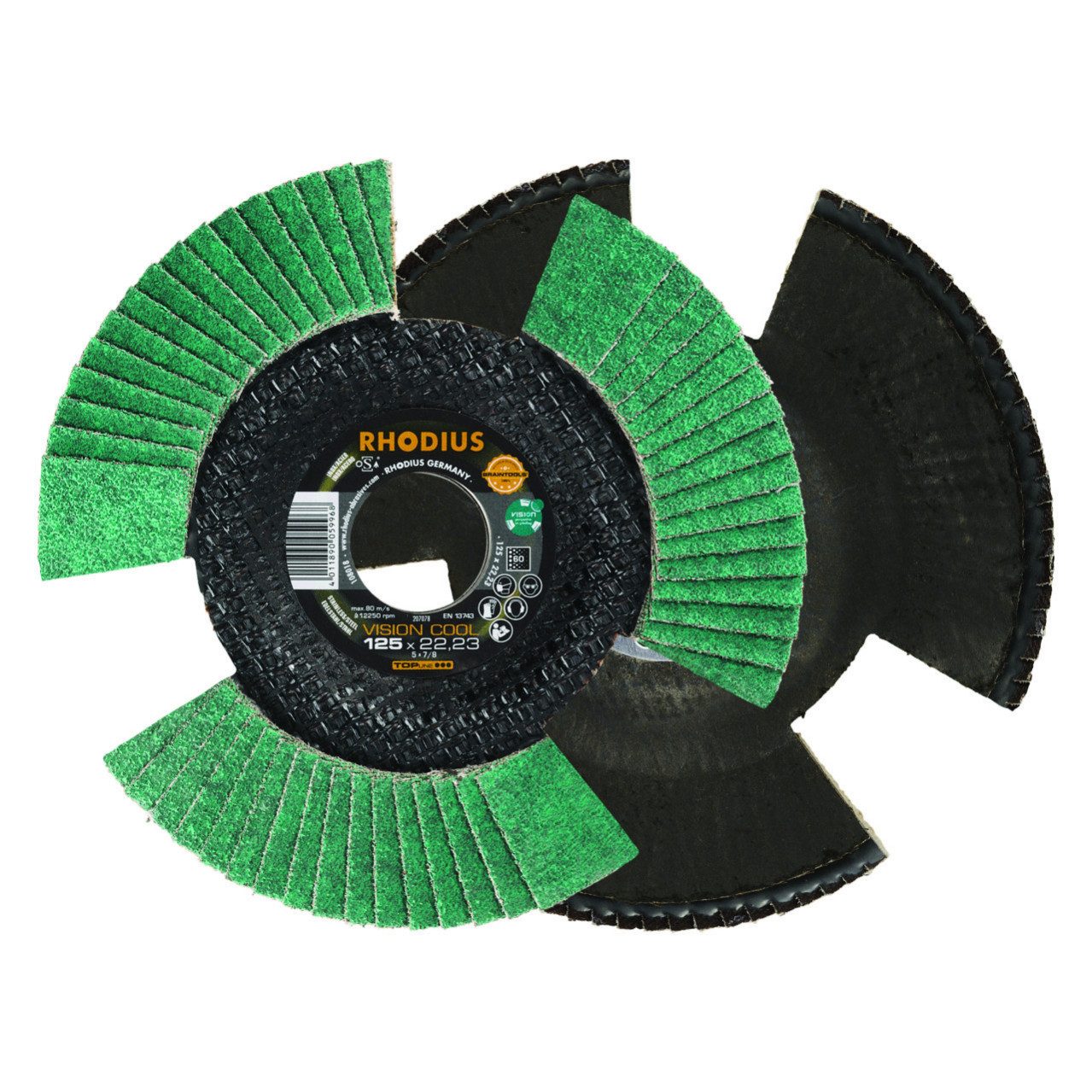 Die Fächerschleifscheibe RHODIUS VISION COOL ermöglicht Ihnen die permanente Sicht auf ihr Werkstück. Durch drei spezielle Aussparungen wird die VISION COOL beim Drehen transparent und Sie behalten die volle Kontrolle über Ihre Arbeit. Einem weiteren Effekt ihres intelligenten Designs verdankt sie den Beinamen COOL, denn sie schleift bis zu 50 % kühler als andere Fächerschleifscheiben.