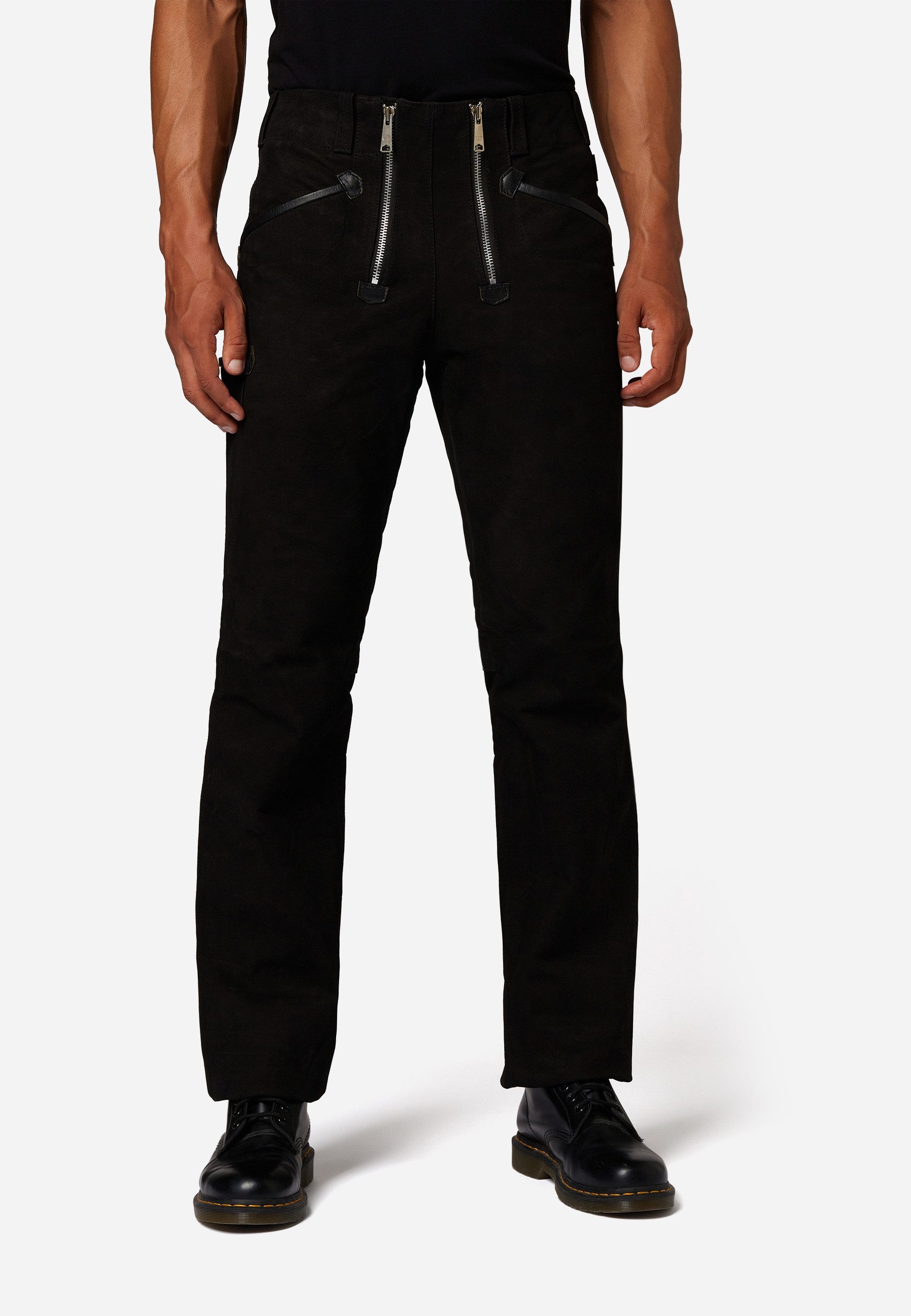 Die Zimmermannshose ist eine beliebte Herrenlederhose, deren Schnitt an die klassische Zimmermannshose erinnert, die auch als Zunfthose, Walzhose, Lufthose oder Wanderhose bekannt ist. Das traditionelle Design der Lederhose hat die unverwechselbaren Details des Originals beibehalten: zwei vordere Metallreißverschlüsse am Bund, zwei seitliche Eingrifftaschen mit verstärkten Kanten, eine Gesäßtasche mit Knopf und eine praktische Zollstocktasche auf der rechten Seite. Der ergonomische Schnitt der Lederhose ist einem trendigen Denim-Schnitt nachempfunden und sorgt für eine bequeme Passform mit normaler Leibhöhe und geradem Bein. Die Lederhose ist zudem mit einem atmungsaktiven, hautfreundlichen Polysatinfutter und praktischen Gürtelschlaufen ausgestattet.