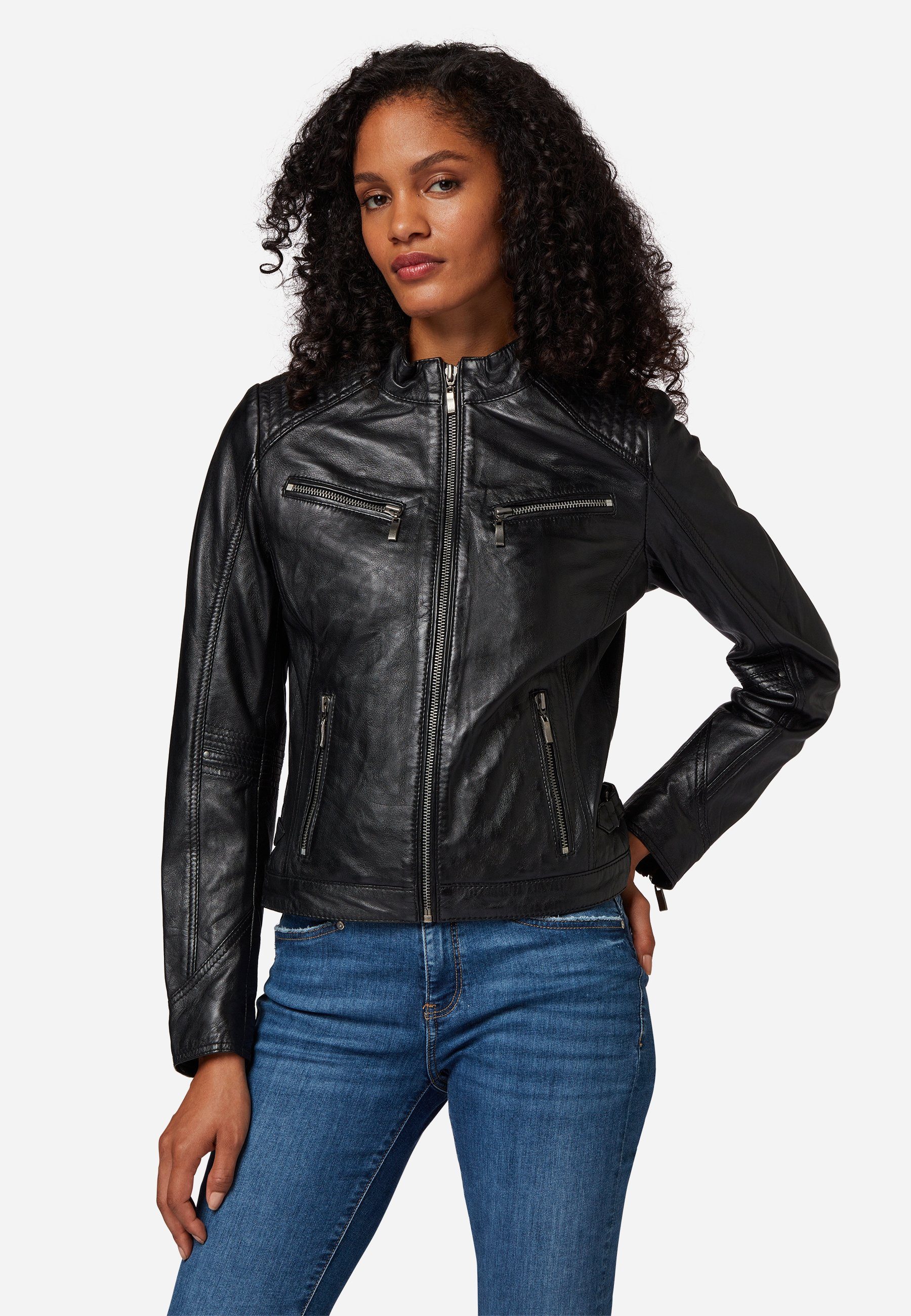 Die „Hannah“ kombiniert klassischen Biker-Look mit femininer Eleganz. Der Stehkragen und die markante Schulterpartie verleihen der Jacke eine selbstbewusste Ausstrahlung.