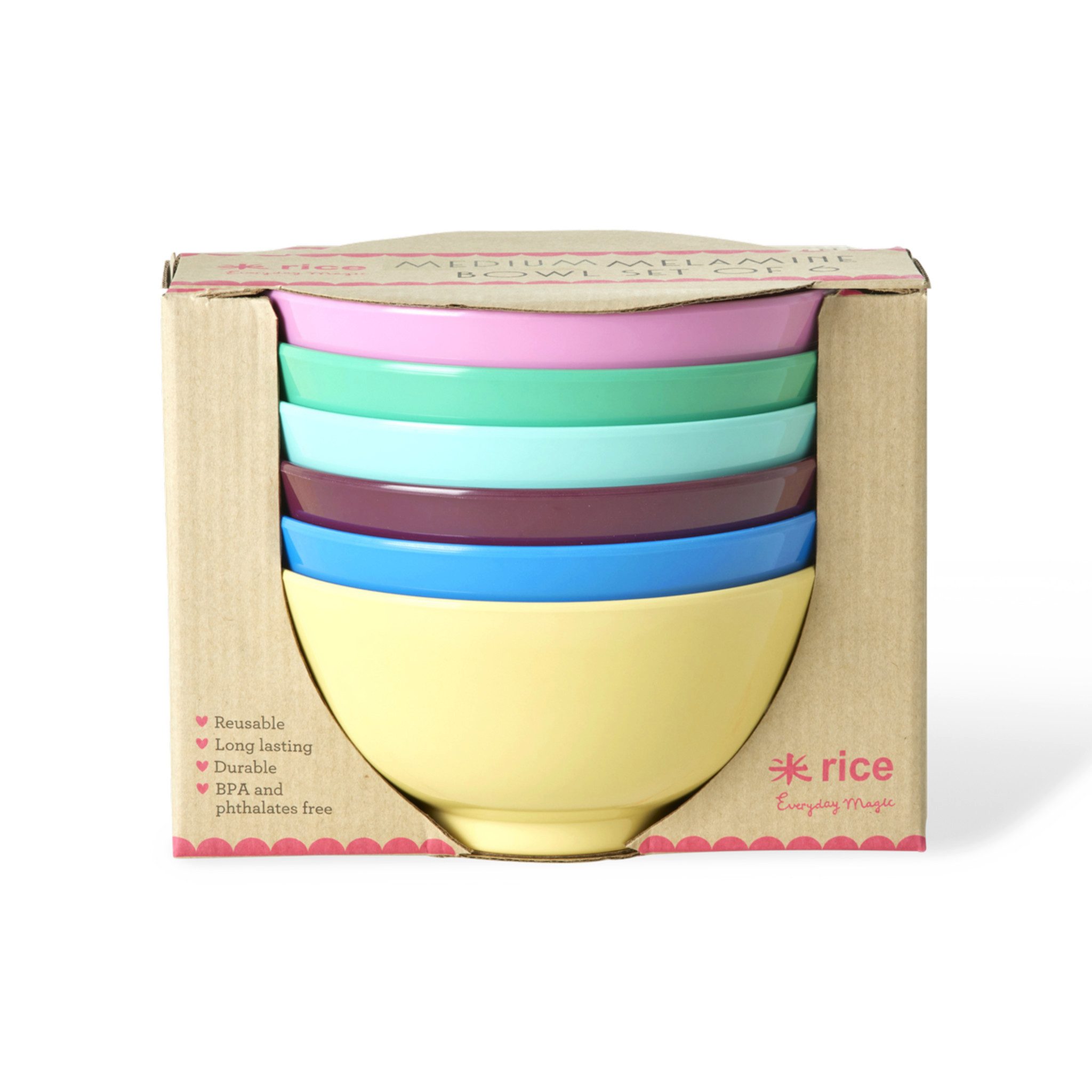Die wunderschönen mittelgroßen Melaminschalen im 6er-Set in den hübschen „Show Your True Colors“-Farben. Melamin ist langlebig und aufgrund seiner Robustheit und einfachen Reinigung ideal für den täglichen Gebrauch. Es nimmt weder Farbe noch Geschmack von Lebensmitteln an – perfekt für das Frühstück, eine Suppe, eine kleine Blume oder Süßigkeiten am Freitagabend! Bitte beachte, dass das Produkt nicht für die Mikrowelle geeignet ist.