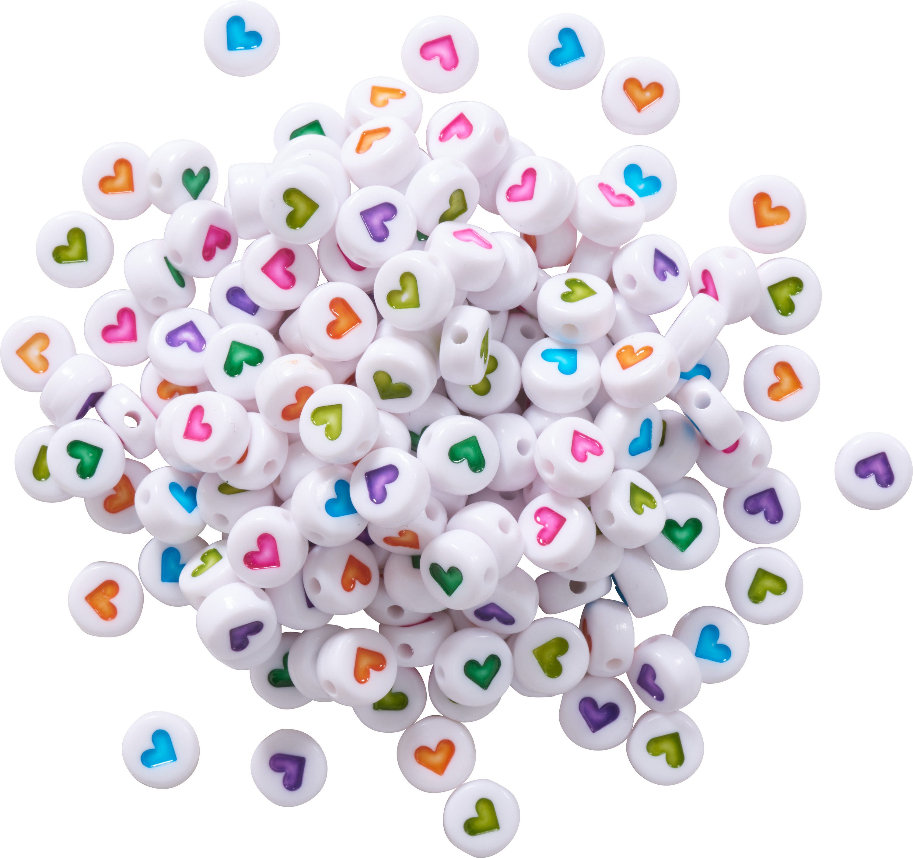 Hervorragendes Perlen-Set, rund bestehend aus 165 Perlen mit bunten Herzen verziert. Die Perlen haben einen Ø ca. 7 mm mit einer Stärke von ca. 4 mm. Der Ø der Bohrung beträgt ca. 1 mm. Mit diesen Perlen lassen sich wundervolle Ketten, Freundschaftsbänder, Armbänder oder Schlüsselanhänger fertigen. Aber auch zum Verzieren Grußkarten, Scrapbook-Alben, Geschenkverpackungen und vielem mehr sind die Perlen super.