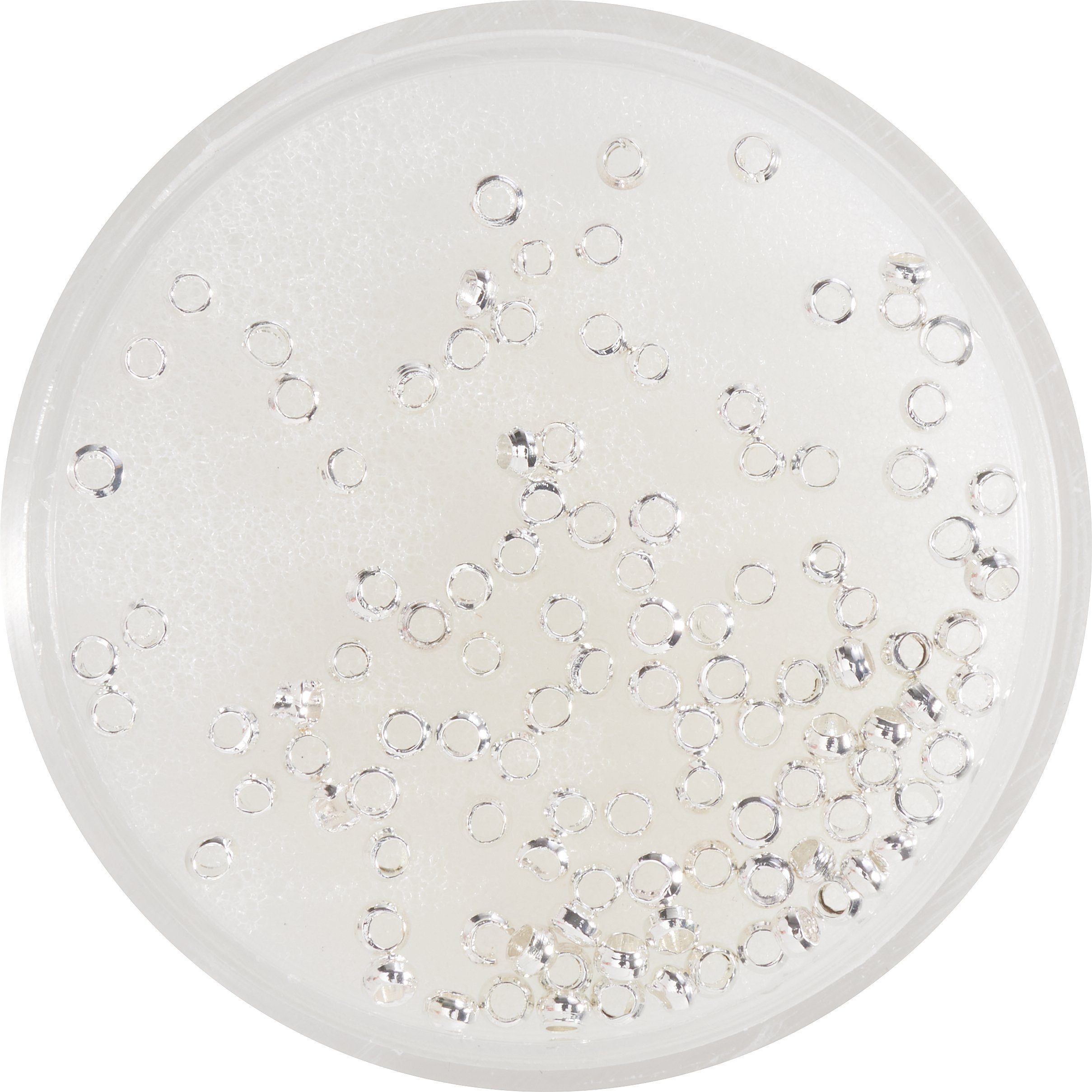 Verwenden Sie diese Quetschperlen in Silber zum Befestigen eines Verschlusses oder kleiner Elemente als unsichtbarer Spacer zwischen verschiedenen Perlen. Mit Hilfe einer Flachzange werden die Quetschperlen an dem Schmuckband zusammengequetscht. Hervorragend für filigrane Schmuckkollektionen. Sie erhalten ca. 100 Quetschperlen mit einem Ø von ca. 2 mm.
