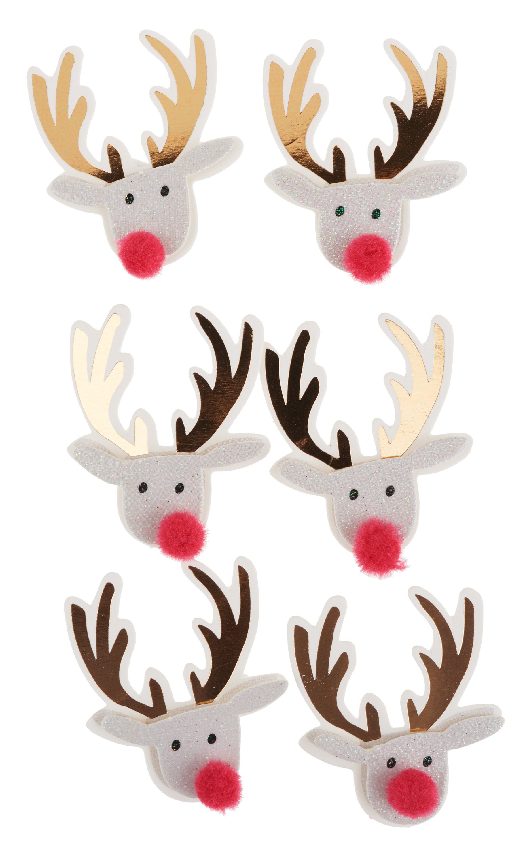 Sechs tolle 3D Sticker im Rentier Design befinden sich in einer Packung. Die Sticker können mit einem kleinen Klebepunkt auf der Rückseite des Rentieres befestigt werden.