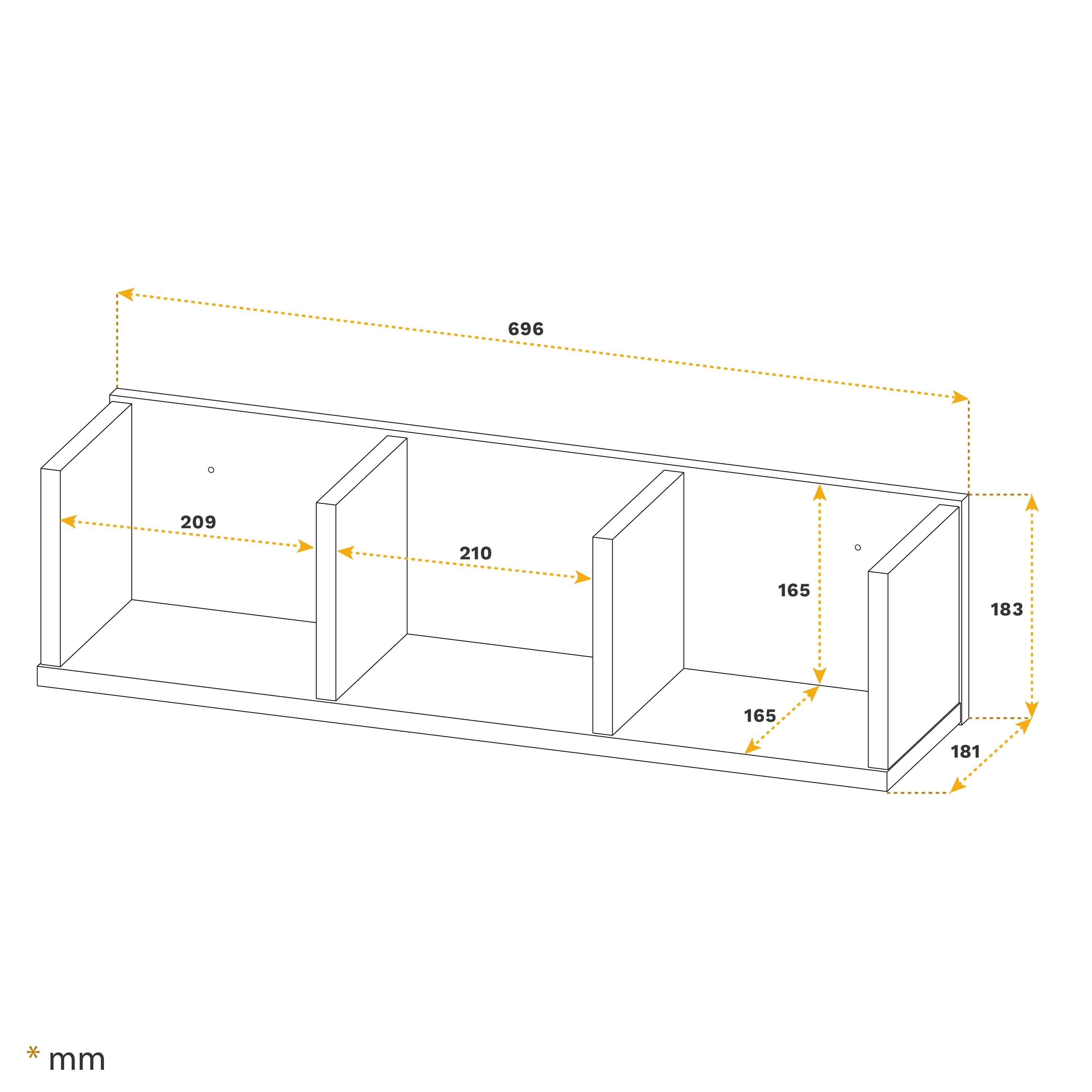 Dieses Schweberegal ist ein kleines schwebendes Bücherregal zum Aufhängen an der Wand. 3 Fächer bieten viel Platz zur Aufbewahrung von Dekoration und mehr. Ideal fürs Wohnzimmer, Schlafzimmer, Kinderzimmer, Jugendzimmer, den Flur oder das Büro oder auch zur Küchenorganisation, z.B. als Gewürzregal oder Kräuterregal in der Küche. Das Wandboard bietet vielseitigen Stauraum. Die Fächer dienen als Ablage für Bücher, Spielzeug, Pflanzen, Deko, Lautsprecher. Auch als CD Ständer oder DVD Regal nutzbar. Innenliegende Verschraubungen und der Farbe entsprechende Schraubenabdeckungen runden das Design ab. Dank der praktischen Aufhängung kann es quer oder hochkant aufgehängt und daher auch als Eckregal genutzt werden. Dieses Möbelstück ist modern, freischwebend und aus Pressspanplatten gefertigt. Es ist nur für den Innen-Bereich geeignet.