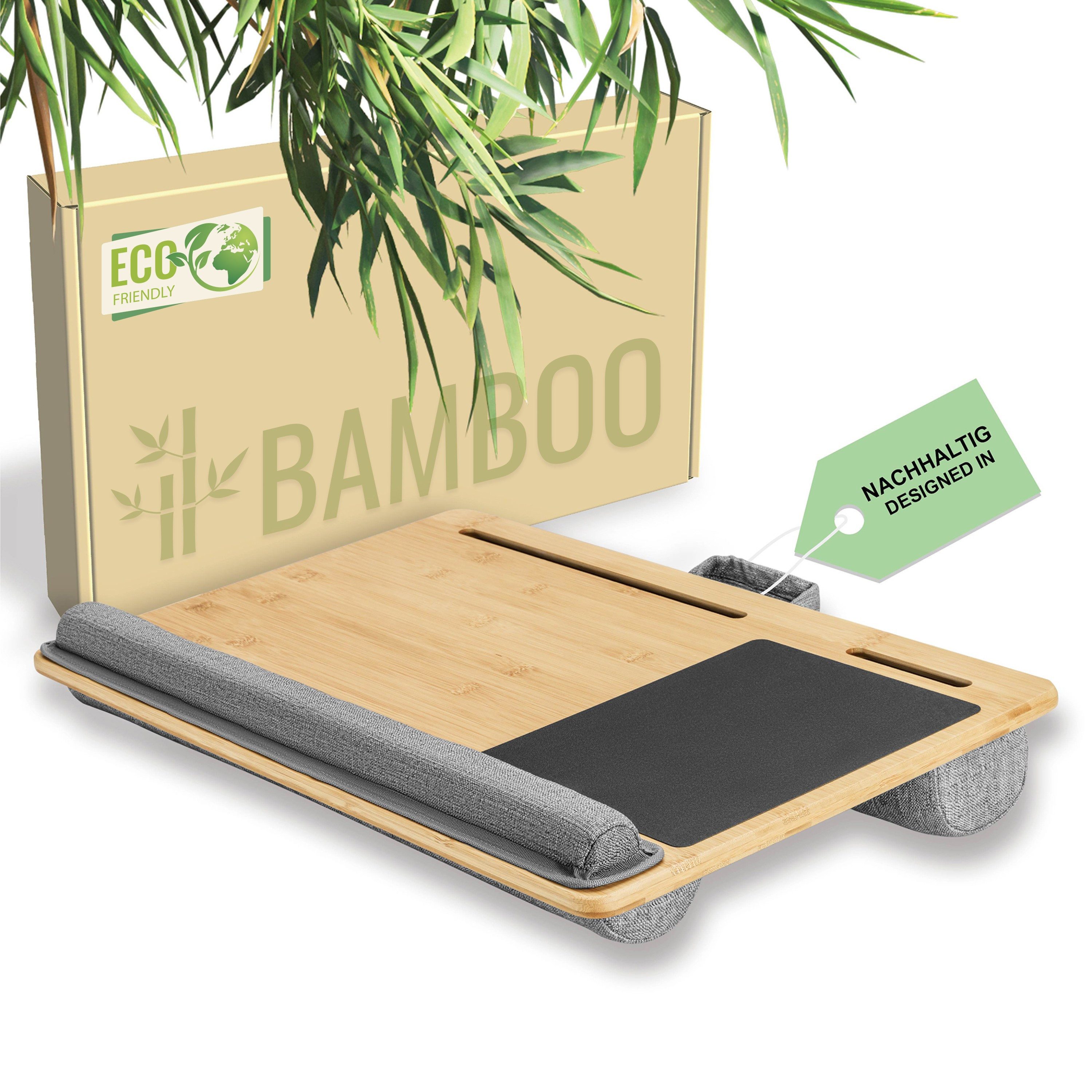 Die ergonomische Handgelenkauflage aus weichem Material beugt Ermüdungserscheinungen vor und ermöglicht ein angenehmes Tippen. Die Tablettplatte aus hochwertigem Bambus verleiht dem Laptop-Kissen eine natürliche Optik und sorgt für Stabilität.