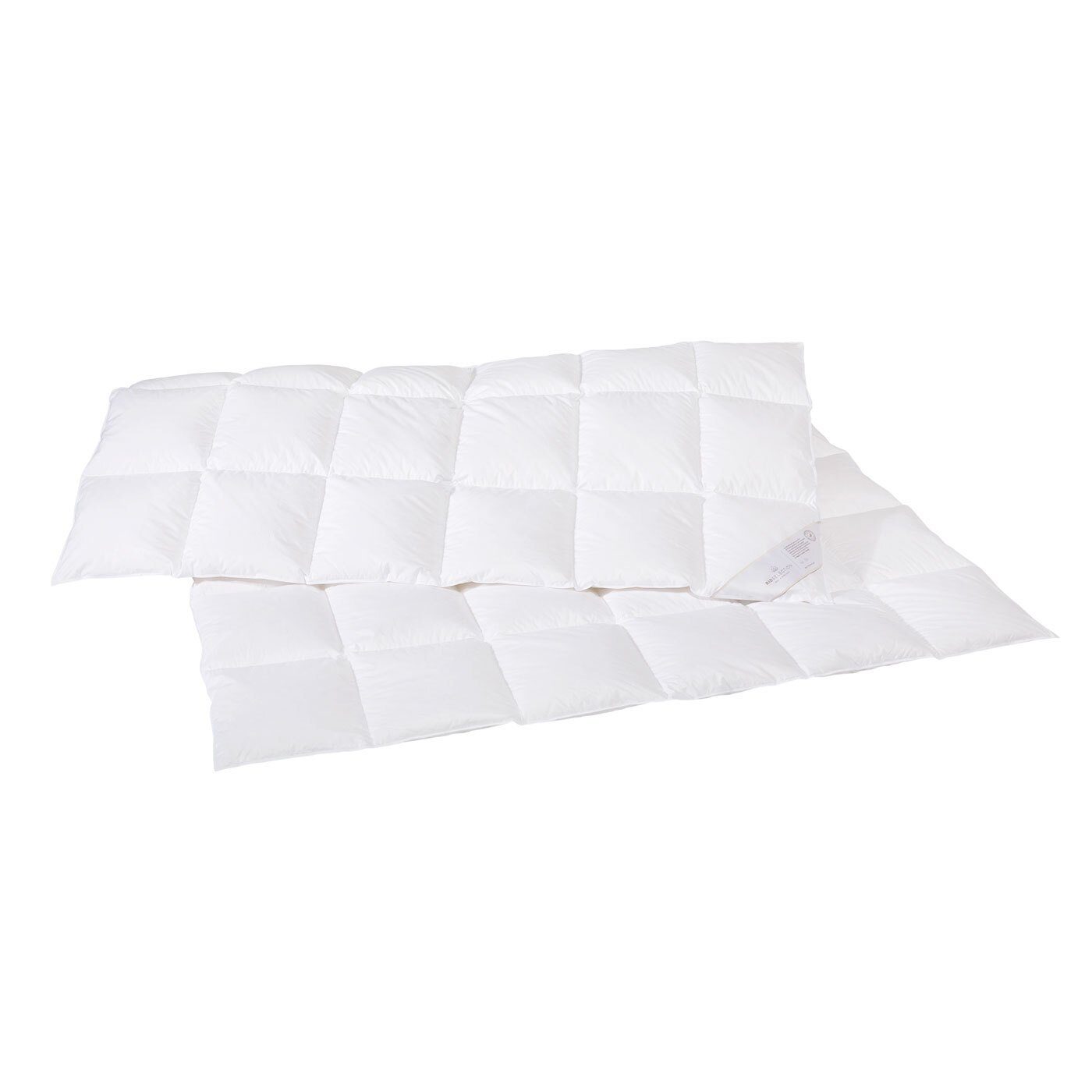 Unter der Daunendecke "Selection Gold" medium werden Sie ein ganz neues Schlafgefühl entdecken. Ein leichter Genuss, er Sie begeistern wird. Diese Premium-Daunendecke bietet optimiertes Wärmerückhaltevermögen für das ganze Jahr in temperierten Schlafräumen bei sehr niedrigen Gewicht. Das wird durch die Verwendung bester und großflockigster Daunen von allerbester Herkunft und Güte in Verbindung mit einem superfeinen und superleichten Batist aus feinsten Baumwollgarnen erreicht. Ein Hochgenuss für Liebhaber leichter Daunendecken. Unsere Manufaktur in Bayern fertigt nach altbewährter Tradition und in sorgfältiger Handarbeit feinste Daunendecken. Jedes Produkt ist ein hochwertiges Einzelstück, das mit viel Hingabe entsteht. Durch die handwerkliche Tradition und Liebe zum Detail wird jede Daunendecke individuell gefertigt. Dadurch wird eine sanfte Gleichmäßigkeit der Daunenverteilung erzielt. Durch die eleganten und dezenten Außennähte und die großzügige Konfektionierung wird eine perfekte Optik und Passform im Bettbezug gewährleistet. Um diese Daunendecke bestmöglich zu pflegen, beachten Sie bitte folgende Pflegehinweise. Regelmäßiges Aufschütteln und im Schatten Lüften erhöht die Langlebigkeit der Daunen. Bitte vermeiden Sie Absaugen und Klopfen. Diese Daunendecke ist bei 60ø Grad waschbar. Trocknen in einem Tumbler. Bitte verzichten Sie auf eine chemische Reinigung.