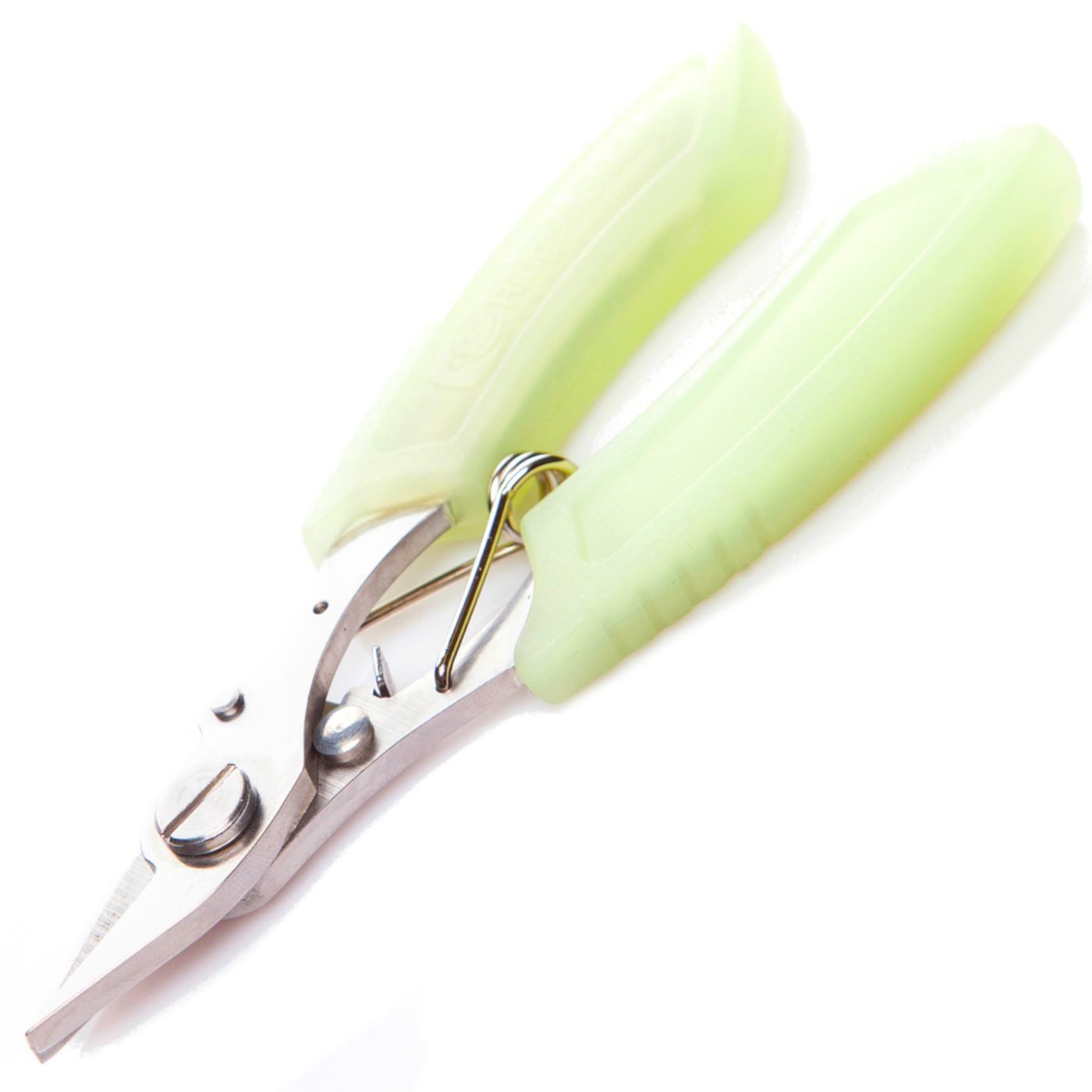 RidgeMonkey Nite-Glo Braid Scissors - Angelschere - Die Vorfachschere von RidgeMonkey besitzt sehr scharfe, robuste sowie gezackte Klingen und sie ist ein tolles Hilfsmittel beim Bau von Karpfenmontagen. Die Angelschere dient sowohl zum Zerschneiden von monofilen Angelschnüren als auch von geflochtenen Schnüren. Für eine einfache Bedienung ist der Schnurcutter mit einem stabilen Federmechanismus ausgestattet. Der Nite Glo Effekt an den Griffen erleichtert die Suche nach der Schere im Dunkeln.