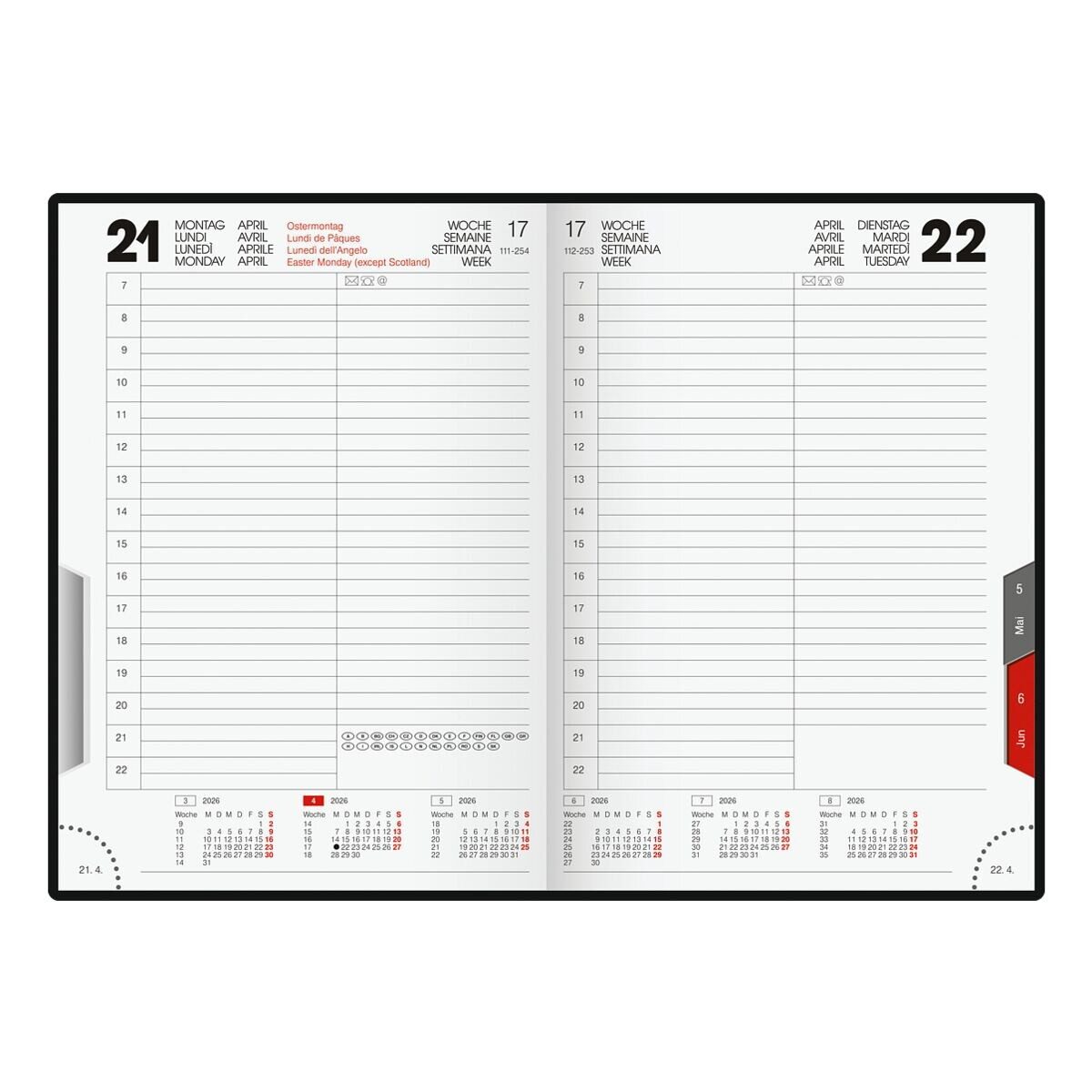 Buchkalender »Roma« 2026, Ausführung: 1 Seite = 1 Tag, 7 - 23 Uhr (2 Zeilen pro Stunde), Tages- und Wochenzählung, Monatsübersicht, Kalendarium: 4-sprachig in schwarz-rot (deutsch, englisch, französisch, italienisch), mit Monats-Registerschnitt, Seitenecken perforiert, Einmerkband, mit Balacron-Einband (schwarz), Gesamtumfang: 415 Seiten mit 10 Seiten Notizen kariert, 32 Seiten Adressregister auswechselbar, Maße (B/T/H): 14,2/2,7/20,0 cm, Gewicht: 595 g