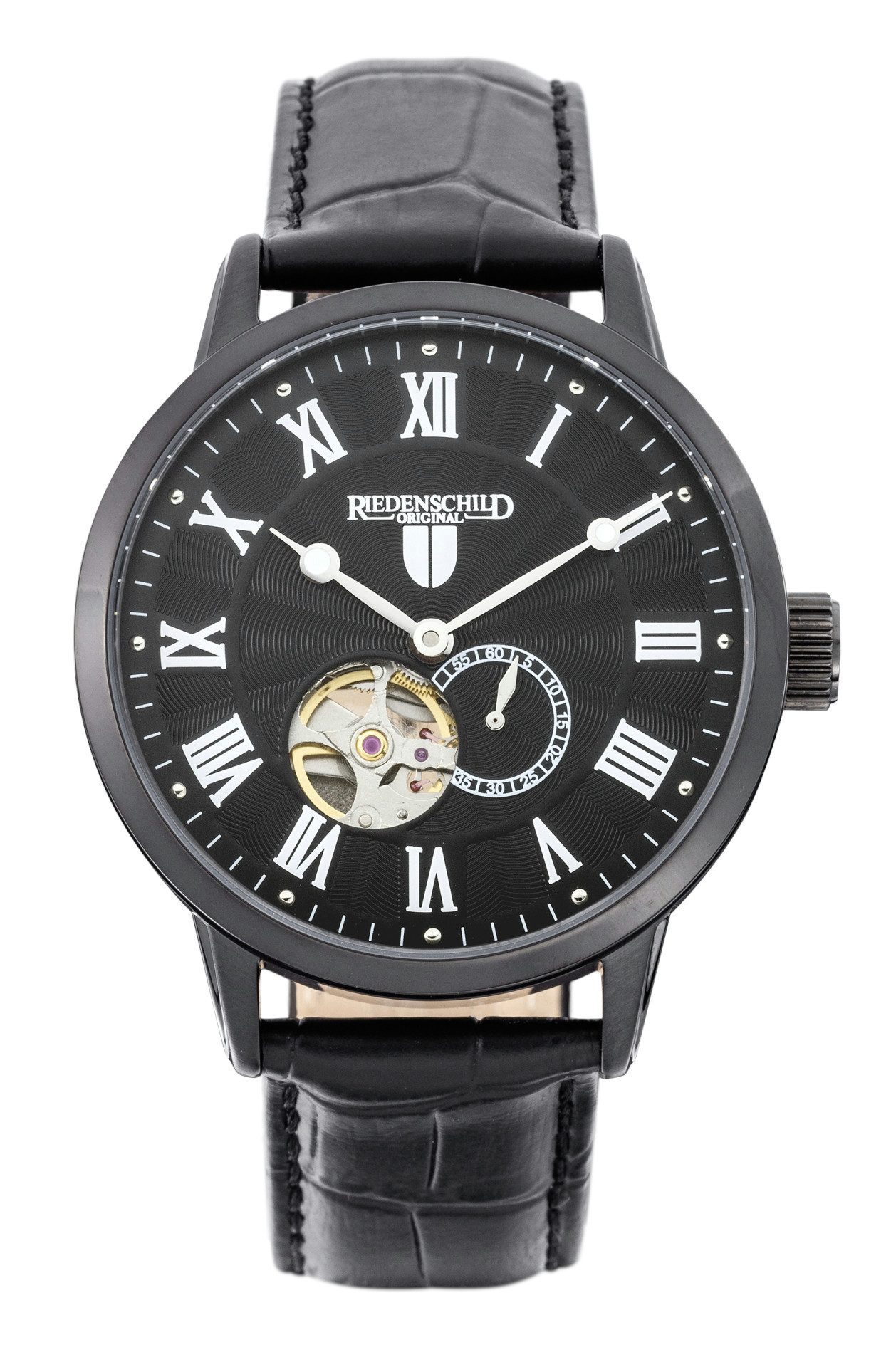 Edle Automatikuhr in elegantem Design. Dazu verleiht das Sichtfenster mit Blick auf die Unruhe und der denzentralen Sekunde dem eleganten Look der Uhr den letzten Schliff. Das schwarze Lederarmband mit Alligatorprint und schwarzer Naht passt perfekt zum Zifferblatt. Die silbernen Zeiger und Indizes sind gut erkennbar. Zudem ist das Modell bis zu 5 ATM Wasserdicht und hat eine glatte Lünette. Die Uhr wird von einem Japanischem Automatikwerk von Miyota angetrieben. Ein schwarz IP-beschichtetes, aus Edelstahl gefertigtes Gehäuse, rundet das vollkommene Design ab. Durch den Gehäuseboden mit Glaseinsatz kann das ganggenaue Automatikuhrwerk mit einer Gangreserve von 42 Stunden von Miyota betrachtet werden.
